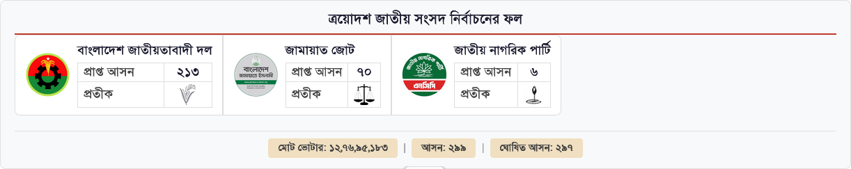 সারা বাংলাদেশে প্রতীক নিয়ে চূড়ান্ত লড়াইয়ে মাঠে নামছেন ১ হাজার ৯৬৭ প্রার্থী। বাছাইয়ে বৈধ প্রার্থী ছিল ১ হাজার ৮৫৮। এর মধ্যে প্রার্থিতা ফিরে পেয়েছেন ৪৩১ জন। এ ছাড়া ৩০৫ জন প্রার্থিতা প্রত্যাহার করেন। বাতিল মনোনয়নপত্রের আরো পড়ুন
