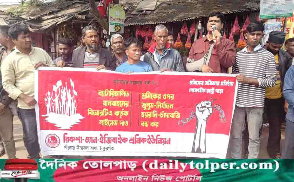 বুধবার সকাল ১১টায় পীরগঞ্জ পূর্ব চৌরাস্তায় চাঁদা বন্ধের দাবীতে শ্রমিকরা মানববন্ধন ও বিক্ষোভ করেছে। পৌর শহরের পূর্ব চৌরাস্তা মোড়ে ব্যাটারী চালিত রিক্সা ভ্যান, সিএনজি, পাগলু ও অটোচার্জার গাড়ির ৩শতাধিক শ্রমিক বিক্ষোভে অংশ নেয়। পীরগঞ্জ পূর্ব চৌরাস্তা থেকে ঠাকুরগাঁও, বীরগঞ্জ, দিনাজপুর, রাণীশংকৈল উপজেলায় যাতায়াত করা ওই সব গাড়ির চালকদের কাছ থেকে এলাকার কিছু প্রভাবশালী লোকজন নিয়মিত ও বাধ্যতামূলক চাঁদা আদায় করতো।