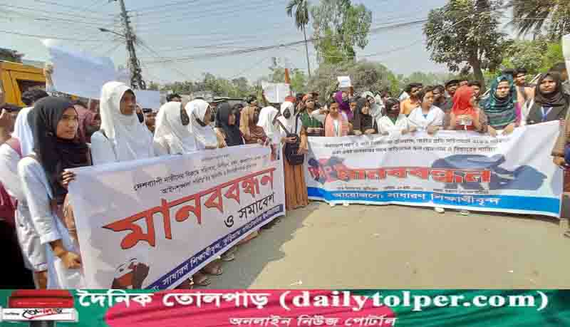 সোমবার (১০ মার্চ) সকাল ১০টায় সাধারণ শিক্ষার্থীদের ব্যানারে শহরের বিভিন্ন সড়ক প্রদক্ষিণ শেষে শাপলা চত্ত্বরে মানববন্ধন ও সমাবেশ করে। এতে বিভিন্ন শিক্ষা প্রতিষ্ঠানের শিক্ষার্থীরা অংশ নেয়।