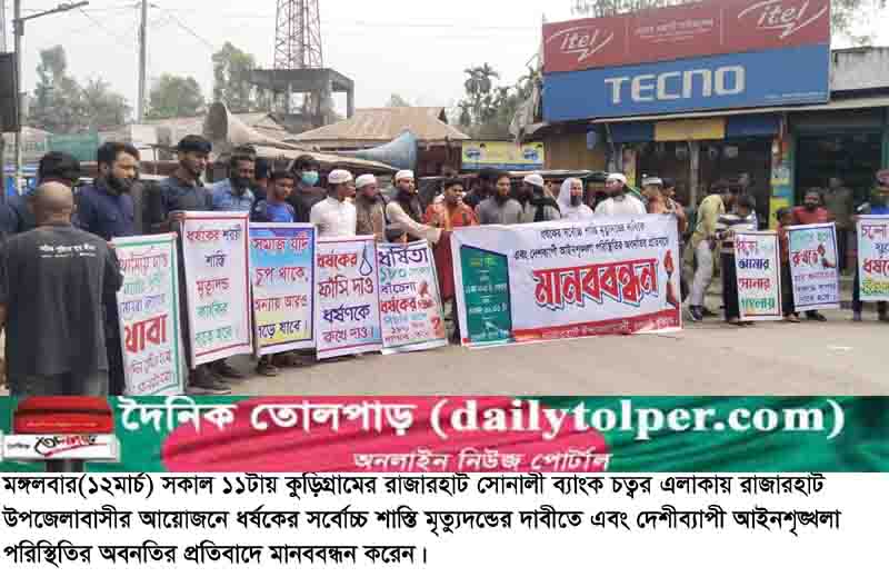 মঙ্গলবার(১২মার্চ) সকাল ১১টায় রাজারহাট সোনালী ব্যাংক চত্বর এলাকায় রাজারহাট উপজেলাবাসীর আয়োজনে ধর্ষকের সর্বোচ্চ শাস্তি মৃত্যুদন্ডের দাবীতে এবং দেশীব্যাপী আইনশৃঙ্খলা পরিস্থিতির অবনতির প্রতিবাদে বিক্ষোভ মিছিল বের করে রাজারহাট বাজারের প্রধান প্রধান সড়ক প্রদক্ষিণ করে।
