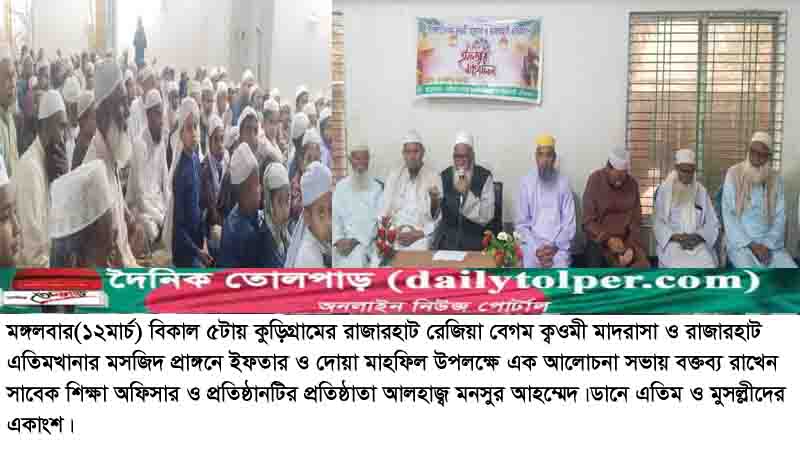 কুড়িগ্রামের রাজারহাট রেজিয়া বেগম ক্বওমী মাদরাসা ও রাজারহাট এতিমখানায়র আয়োজনে ইফতার মাহফিল অনুষ্ঠিত হয়েছে।