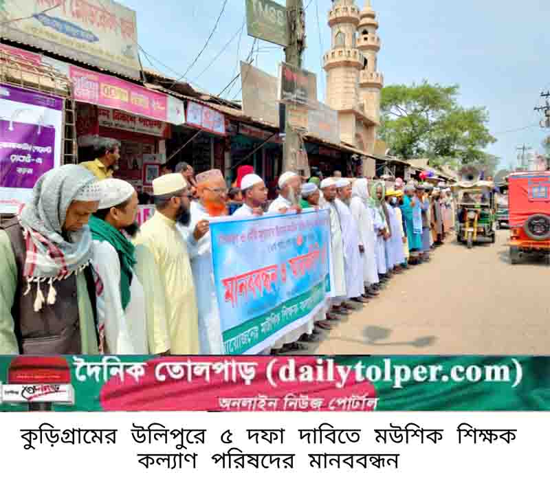 কুড়িগ্রামের উলিপুরে বাংলাদেশ মউশিক শিক্ষক কল্যাণ পরিষদ মানববন্ধন করে স্মারকলিপি প্রদান করেছে। রবিবার (২৩ মার্চ) বেলা ১১টায় কুড়িগ্রাম-চিলমারী সড়কের বড় মসজিদ মোড়ে, মউশিক শিক্ষক কল্যাণ পরিষদ উপজেলা শাখার আয়োজনে, ইসলামিক ফাউন্ডেশন কর্তৃক পরিচালিত নৈতিকতা ও ধর্মীয় মূল্যবোধ উন্নয়নে মসজিদ ভিত্তিক শিশু ও গণশিক্ষা কার্যক্রম প্রকল্প (৮ম পর্যায়) পাসসহ ৫ দফা দাবিতে উপজেলার সকল মউশিক শিক্ষক-শিক্ষিকাবৃন্দ মাববন্ধন কর্মসূচী পালন করে প্রধান উপদেষ্টা বরাবর স্মারকলিপি প্রদান করেছে।