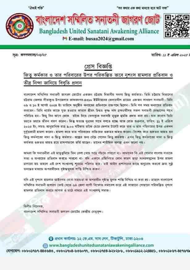 জিতু কর্মকার চট্টগ্রামের ছেলে, বাংলাদেশ সম্মিলিত সনাতনী জাগরণ জোটের কর্মী। সদ্য ‘মবজোট’ তাঁকে বেধড়ক মারপিট করে। তাঁর ‘হাতজোড়’ করা ছবিটি বলে দেয় বাংলাদেশে হিন্দুদের চলমান বাস্তবতা। দুর্বৃত্তরা ১১ই এপ্রিল ২০২৫ রাতে জিতু’র বাড়ীতে আক্রমন করে, এবং সবাইকে বেধড়ক মারধর করে। এতে জিতু ও তাঁর বড়ভাই মারাত্মক আহত হয়। জিতু কর্মকার বর্তমানে সেনাবাহিনীর তত্বাবধানে আছে। বাংলাদেশ সম্মিলিত সনাতন জোট একই দিন একটি বিবৃতি দিয়ে বলেছে, সনাতনী জোট একটি বিবৃতি দিয়ে প্রশ্ন করেছে, ‘আমরা কি এদেশে বাঁচতে পারবো না’? ৪/১৪/২৫