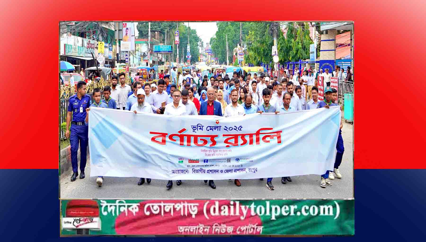 ‘নিয়মিত ভূমি উন্নয়ন কর প্রদান করি, নিজের জমি সুরক্ষিত রাখি’—এই প্রতিপাদ্যে রংপুরে তিন দিনব্যাপী ভূমিমেলা, ২০২৫-এর উদ্বোধন করা হয়েছে। রবিবার (২৫শে মে) সকালে রংপুর জেলাপ্রশাসকের কার্যালয় প্রাঙ্গণে প্রধান অতিথি হিসাবে উপস্থিত থেকে বেলুন উড়িয়ে এই মেলার উদ্বোধন করেন রংপুরের বিভাগীয় কমিশনার মোঃ শহিদুল ইসলাম। উদ্বোধন অনুষ্ঠানে সভাপতিত্ব করেন রংপুরের জেলাপ্রশাসক মোহাম্মদ রবিউল ফয়সাল। ভূমি মেলা উদ্বোধন শেষে একই স্থানে রংপুর বিভাগীয় প্রশাসন ও জেলাপ্রশাসন যৌথ উদ্যোগে এক আলোচনাসভার আয়োজন করা হয়।
