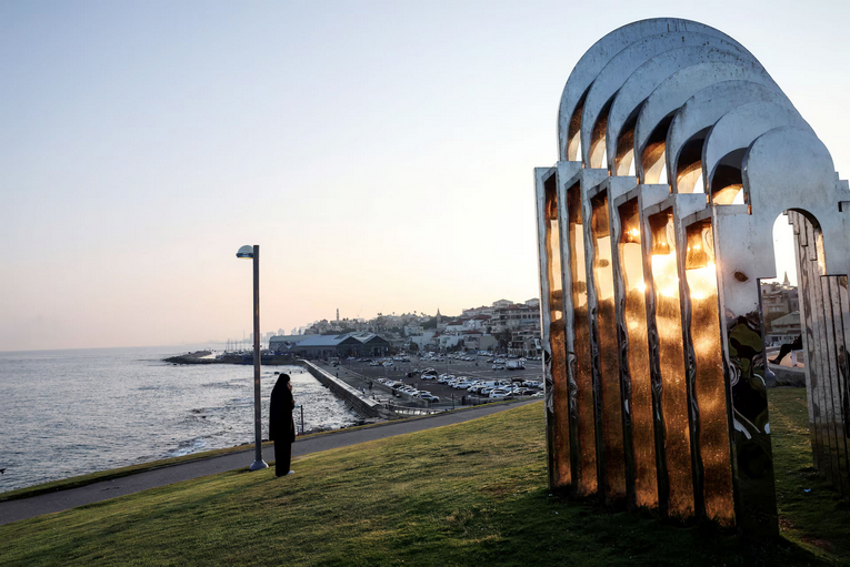 ইসরায়েলের উপকূলীয় শহর জাফায় ভোরবেলা সাগরতীরের কাছে ঈদের জামাতের জন্য অপেক্ষায় থাকা এক মুসলিম নারী
