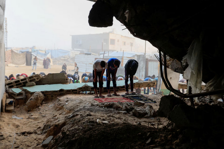 গাজার দক্ষিণাঞ্চলীয় শহর খান ইউনিসে ইসরায়েলি বাহিনীর গোলায় ধ্বংস হয়ে যাওয়া আল-আলবানি মসজিদ চত্বরে ঈদুল আজহার জামাত হয়েছে