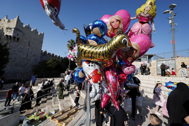 জেরুজালেমের পুরোনো শহরের দামাস্কাস গেট এলাকায় বেলুন বিক্রি করছেন এক ব্যক্তি।