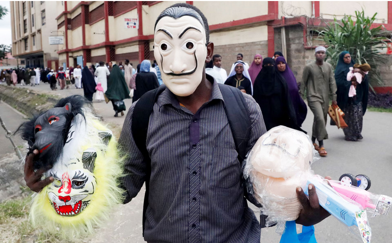 গতকাল ৬ জুন ঈদুল আজহা উদযাপিত হয়েছে পূর্ব আফ্রিকার দেশ কেনিয়ায়। রাজধানী নাইরোবির এনগারা এলাকায় স্যার আলী মুসলিম ক্লাব মাঠের বাইরে মুখোশ ও বাচ্চাদের খেলনা বিক্রি করছেন এক ব্যক্তি।