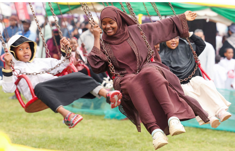 ঈদুল আজহা উপলক্ষ্যে কেনিয়ার স্যার আলী মুসলিম ক্লাব গ্রাউন্ড এলাকায় মেলা বসেছে। মেলায় রাইডে চড়েছেন দু’জন। ছবি ৬ জুনের।