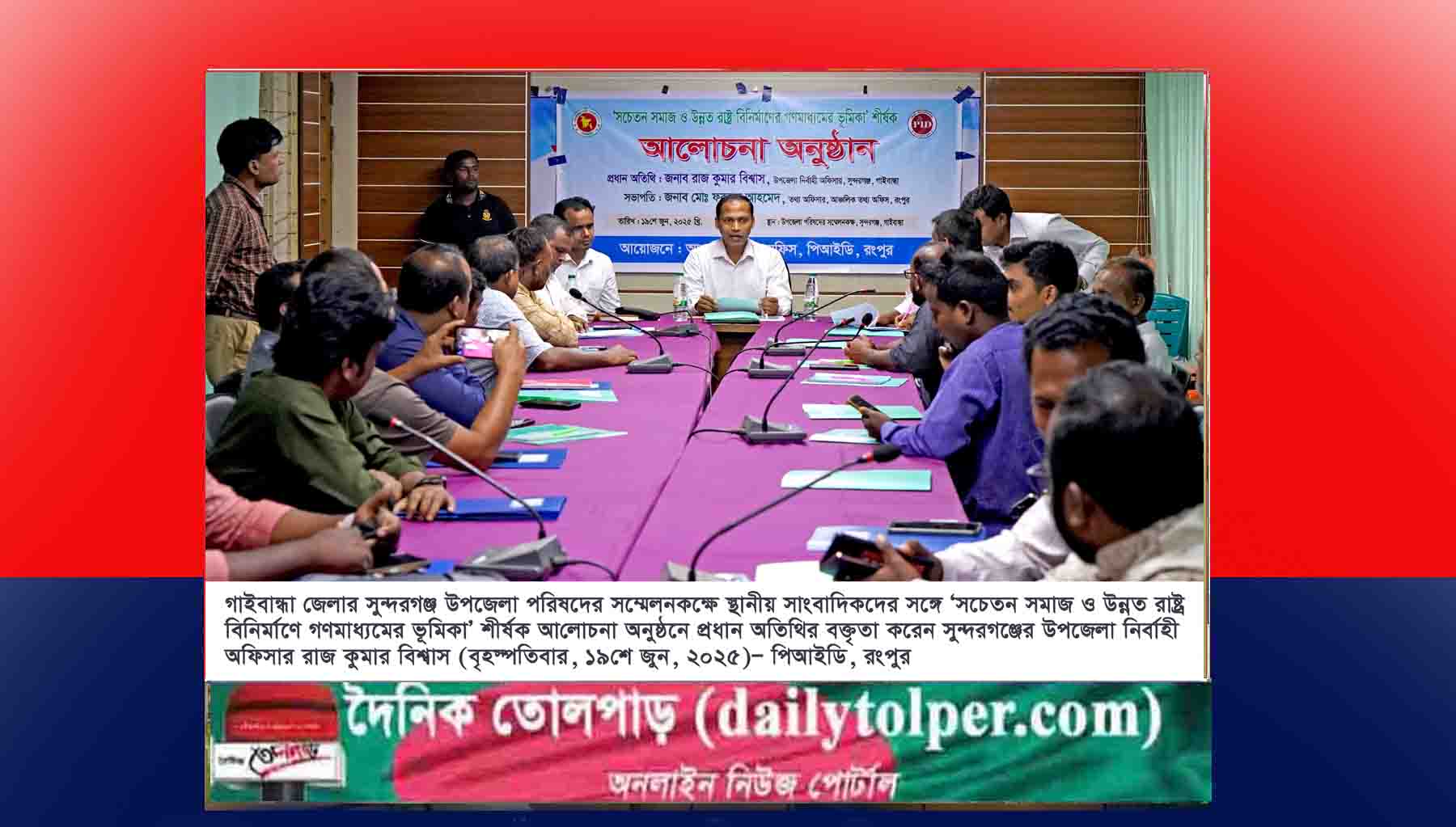 রংপুর আঞ্চলিক তথ্য অফিসের উদ্যোগে ‘সচেতন সমাজ ও উন্নত রাষ্ট্র বিনির্মাণে গণমাধ্যমের ভূমিকা’ শীর্ষক আলোচনা অনুষ্ঠিত হয়েছে। বৃহস্পতিবার (১৯ জুন) দুপুরে গাইবান্ধা জেলার সুন্দরগঞ্জ উপজেলা পরিষদের সম্মেলনকক্ষে আলোচনা অনুষ্ঠানে প্রধান অতিথি হিসাবে উপস্থিত ছিলেন সুন্দরগঞ্জ উপজেলা নির্বাহী অফিসার রাজ কুমার বিশ্বাস। অনুষ্ঠানে সভাপতিত্ব করেন রংপুর আঞ্চলিক তথ্য অফিসের তথ্য অফিসার মোঃ ফরহাদ আহমেদ।