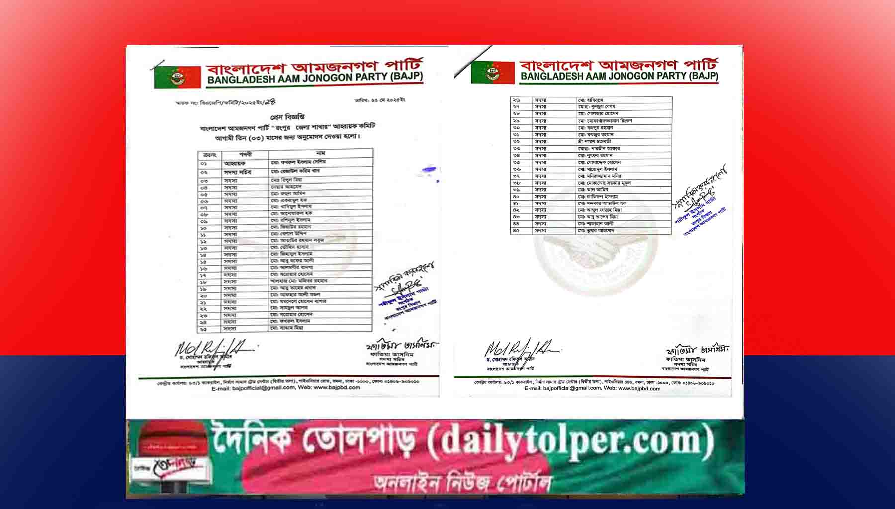 বাংলাদেশ আমজনগণ পার্টি (বিএজেপি) রংপুর জেলা শাখার ৪৫ সদস্য বিশিষ্ট আহ্বায়ক কমিটি আগামী তিন (০৩) মাসের জন্য অনুমোদন দেওয়া হয়েছে। পার্টির প্রতিষ্ঠাতা আহবায়ক ড. মোহাম্মদ রফিকুল আমিন ও সদস্য সচিব ফাতিমা তাসনিম এই কমিটির অনুমোদন করেন। এতে রংপুর বিভাগীয় সংগঠক শরিফুল ইসলাম গাজী সুপারিশ করেন।