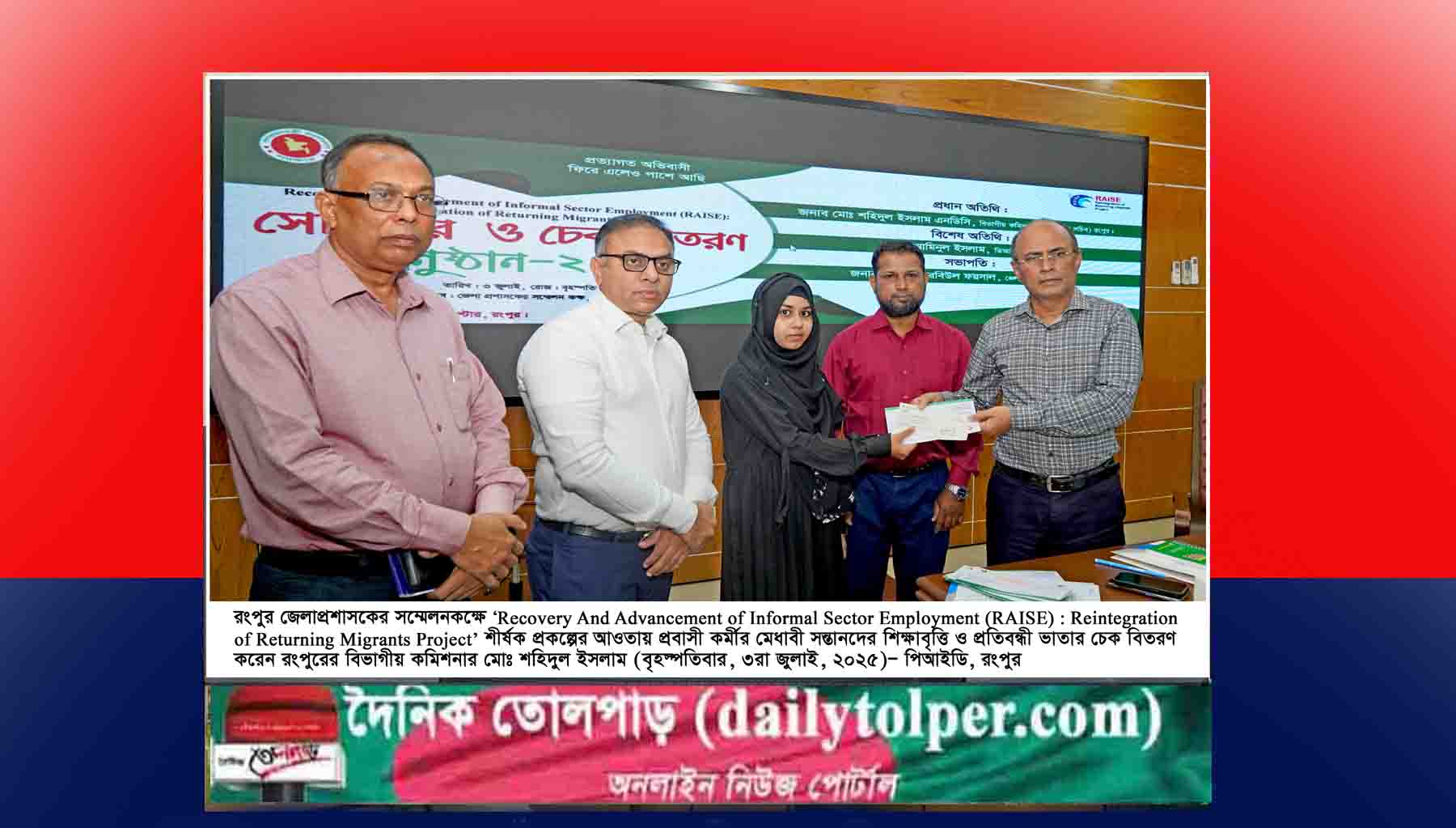 রংপুরে ওয়েজ আর্নার্স কল্যাণ বোর্ড, প্রবাসী কল্যাণ ও বৈদেশিক কর্মসংস্থান মন্ত্রণালয় কর্তৃক বাস্তবায়নাধীন ‘Recovery And Advancement of Informal Sector Employment : Reintegration of Returning Migrants Project’ শীর্ষক প্রকল্পের আওতায় রংপুর প্রবাসী কল্যাণ সেন্টারের উদ্যোগে প্রবাসী কর্মীর মেধাবী সন্তানদের মাঝে শিক্ষাবৃত্তি ও প্রতিবন্ধী ভাতার চেক বিতরণ করা হয়েছে। বৃহস্পতিবার (৩রা জুলাই) সকালে জেলাপ্রশাসকের সম্মেলনকক্ষে এই অনুষ্ঠানের আয়োজন করা হয়। অনুষ্ঠানে রংপুরের জেলাপ্রশাসক মোহাম্মদ রবিউল ফয়সালের সভাপতিত্বে প্রধান অতিথি হিসাবে উপস্থিত ছিলেন বিভাগীয় কমিশনার মোঃ শহিদুল ইসলাম।