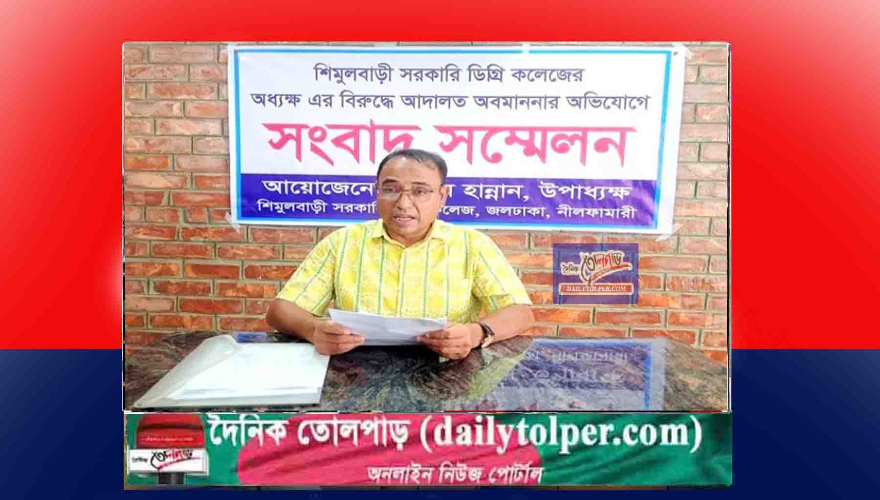 মঙ্গলবার(৮ জুলাই)দুপুর ১২টার দিকে নীলফামারী জেলা শহরের একটি রেস্টুরেন্টের সভাকক্ষে সংবাদ সম্মেলন করেন উপাধ্যক্ষ আব্দুল হান্নান। ওই সংবাদ সম্মেলনে তিনি অভিযোগ করে জানান, ‘২০২১ সালের ৮ আগস্ট শিমুলবাড়ি ডিগ্রি কলেজটি জাতীয়করণ হয়। তখন থেকে তিনি বিধিমালা অনুযায়ী কলেজের উপাধ্যক্ষ হিসেবে ভারপ্রাপ্ত অধ্যক্ষের দায়িত্ব পালন করে আসছেন। তিনি বলেন, ২০১৮ সালের আত্তীকরণ বিধিমালা অনুযায়ী বিসিএস সাধারণ শিক্ষা ক্যাডার, নন-ক্যাডারে পদায়নের বিধান নেই। সে অনুযায়ী তার পদায়ন যৌক্তিক রয়েছে বলে তিনি সংবাদ সম্মেলনে তুলে ধরে বলেন, বিধি ভঙ্গকরে শিক্ষা মন্ত্রনালয়ে ফ্যসিস্ট সরকারের ঘাপটি মেরে থাকা দোসরা শিক্ষা ব্যবস্থায় বিশৃঙ্খলা সৃষ্টির লক্ষে হঠাৎ করে চলতি বছরের ৮ এপ্রিল শিক্ষা মন্ত্রনালয়ের মাধ্যমিক ও উচ্চ মাধ্যমিক শিক্ষা বিভাগের সরকারি কলেজ শাখা-২ এর আদেশে ১৩৫ কলেজের সঙ্গে শিমুলবাড়ি ডিগ্রি কলেজে ক্যাডারভুক্ত অধ্যাপক এ কে এম সিদ্দিকুর রমহানকে অধ্যক্ষ হিসেবে নিয়োগ প্রদান করে। আদেশের প্রেক্ষিতে তিনি ১৭ এপ্রিল কলেজে যোগদান করেন।