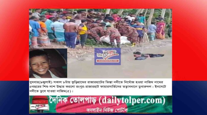 রাজারহাটে তিস্তা নদীতে নিখোঁজ হওয়া শিশু নাজিমের লাশ ১দিন পর উদ্ধার