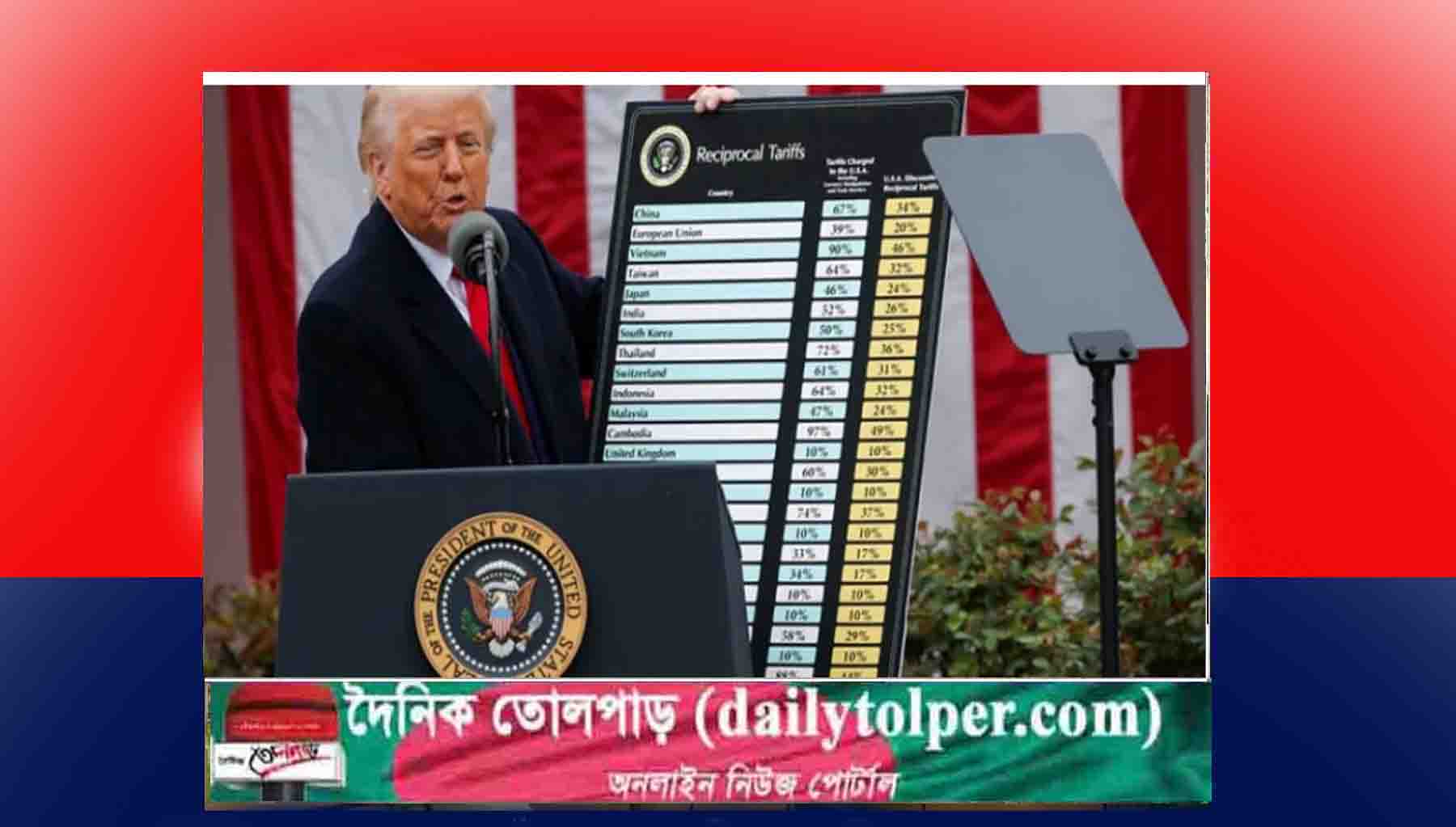 ২ এপ্রিল যুক্তরাষ্ট্র বাংলাদেশি পণ্যের ওপর ৩৭ শতাংশ শুল্ক আরোপ করে। ওয়াশিংটনে হোয়াইট হাউসে সংবাদ সম্মেলনে উচ্চ মাত্রার এই শুল্ক আরোপের ঘোষণা দেন ডোনাল্ড ট্রাম্প। এর আগে যুক্তরাষ্ট্রে আমদানিতে বাংলাদেশি পণ্যের ওপর গড়ে ১৫ শতাংশ শুল্ক ছিল। নতুন এই শুল্ক আরোপে বাংলাদেশের রপ্তানি, বিশেষ করে তৈরি পোশাক খাতে বড় ধরনের নেতিবাচক প্রভাব পড়ার আশঙ্কা দেখা দেয়। বাংলাদেশ থেকে প্রতি বছর ৮৪০ কোটি ডলারের মতো পণ্য যুক্তরাষ্ট্রে রপ্তানি হয়ে থাকে যার বেশিরভাগ তৈরি পোশাক। গত বছর যুক্তরাষ্ট্রে তৈরি পোশাক রপ্তানি হয়েছিল ৭৩৪ কোটি ডলার।