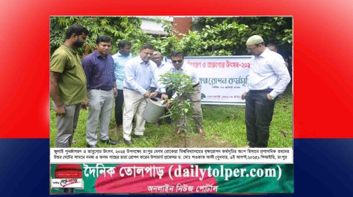 বেগম রোকেয়া বিশ্ববিদ্যালয়ে জুলাই পুনর্জাগরণ ও তারুণ্যের উৎসব, ২০২৫ উপলক্ষ্যে বৃক্ষরোপণ কর্মসূচি পালিত হয়েছে। বুধবার (৬ই আগস্ট) সকালে বিশ্ববিদ্যালয়ের প্রশাসনিক ভবনের উত্তর গেটের সামনে এই কর্মসূচির উদ্বোধন করেন উপাচার্য প্রফেসর ড. মোঃ শওকাত আলী। রুপালি ব্যাংক রংপুর জোনের পক্ষ থেকে বিশ্ববিদ্যালয় ক্যাম্পাসে বনজ ও ফলদ গাছের চারা রোপণ করা হয়।