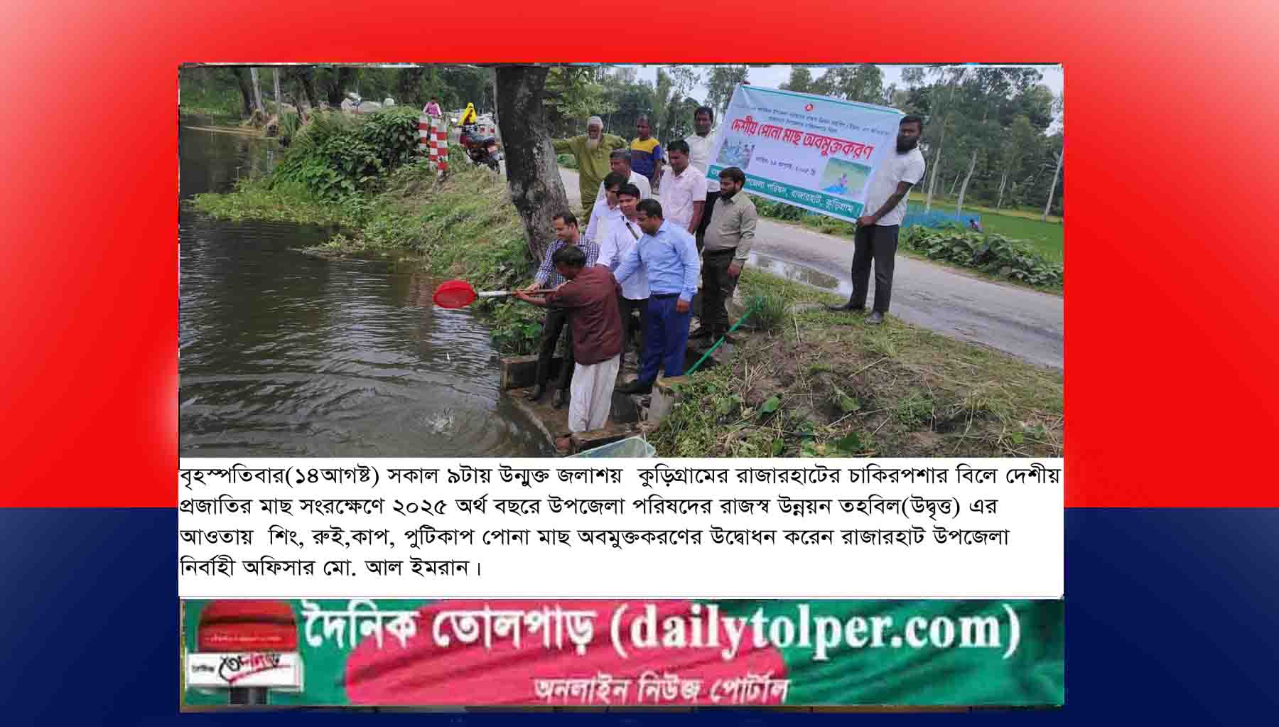 বৃহস্পতিবার(১৪আগষ্ট) সকাল ৯টায় উন্মুক্ত জলাশয় চাকিরপশার বিলে দেশীয় প্রজাতির মাছ সংরক্ষেণে ২০২৫ অর্থ বছরে উপজেলা পরিষদের রাজস্ব উন্নয়ন তহবিল(উদ্বৃত্ত) এর আওতায় শিং, রুই,কাপ, পুটিকাপ পোনা মাছ অবমুক্তকরণের উদ্বোধন করেন রাজারহাট উপজেলা নির্বাহী অফিসার মো. আল ইমরান। এসময় উপস্থিত ছিলেন রাজারহাট উপজেলা সহকারি কমিশনার(ভূমি) আশাদুল হক, উপজেলা মৎস কর্মকর্তা জাহিদুল ইসলাম ও রাজারহাট ইউপি সদস্য আমজাদ হোসেন প্রমূখ।