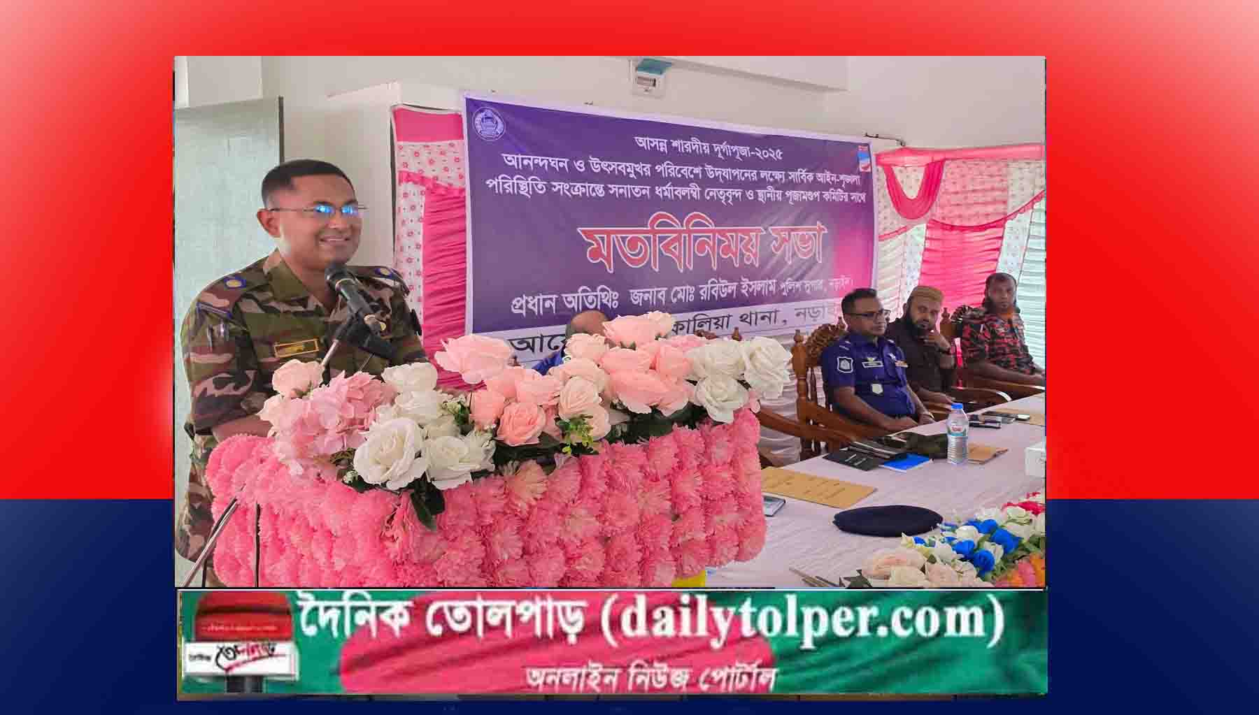 আসন্ন শারদীয় দুর্গোৎসব নির্বিঘ্নে ও শান্তিপূর্ণভাবে উদযাপন উপলক্ষ্যে শনিবার (২০ সেপ্টেম্বর) কালিয়া থানা নড়াগাতী থানায় আইনশৃঙ্খলা ও সার্বিক নিরাপত্তা বিষয়ে কালিয়া ও নড়াগাতী পূজা উদযাপন কমিটির সদস্যদের সাথে মতবিনিময় সভা অনুষ্ঠিত হয়। উক্ত সভায় প্রধান অতিথি হিসাবে উপস্থিত ছিলেন মোঃ রবিউল ইসলাম, পুলিশ সুপার, নড়াইল।
