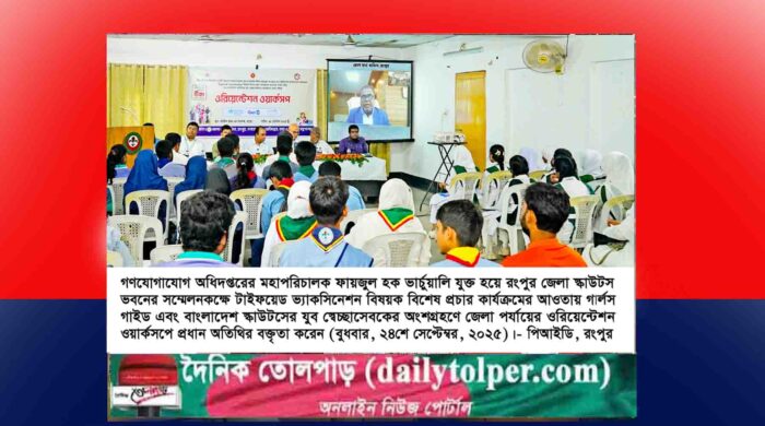 রংপুর ও পঞ্চগড়ে টাইফয়েড টিকাদানে সচেতনতা বৃদ্ধিতে একটি ওরিয়েন্টেশন ওয়ার্কশপ অনুষ্ঠিত হয়েছে। শিশু, কিশোর-কিশোরী ও নারী উন্নয়নে সচেতনতামূলক Typhoid Vaccination বিষয়ক প্রচার কার্যক্রম প্রকল্পের আওতায় গার্লস গাইড এবং বাংলাদেশ স্কাউটসের যুব স্বেচ্ছাসেবকদের অংশগ্রহণে জেলা পর্যায়ে এই ওয়ার্কশপ অনুষ্ঠিত হয়। বুধবার (২৪শে সেপ্টেম্বর) সকালে রংপুর স্কাউট ভবনের সভাকক্ষে অনুষ্ঠিত ওয়ার্কশপে প্রধান অতিথি হিসাবে ভার্চুয়ালি যুক্ত ছিলেন গণযোগাযোগ অধিদপ্তরের মহাপরিচালক ফায়জুল হক। ইউনিসেফ বাংলাদেশের সহায়তায় রংপুর জেলা তথ্য অফিস এই কর্মশালা আয়োজন করে। এছাড়া পঞ্চগড় জেলাপ্রশাসকের সম্মেলনকক্ষ অনুষ্ঠিত এই কর্মশালায় প্রধান অতিথি হিসাবে উপস্থিত ছিলেন পঞ্চগড়ের জেলাপ্রশাসক সাবেত আলী। পঞ্চগড় জেলা তথ্য অফিস এই কর্মশালা আয়োজন করে। অনুষ্ঠানে সভাপতিত্ব করেন পঞ্চগড় জেলা তথ্য অফিসের তথ্য অফিসার (রু.দা.) উজ্জ্বল শীল।
