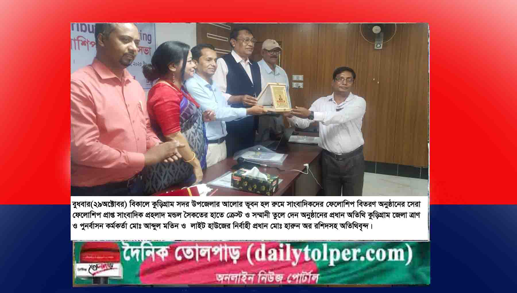 বুধবার(২৯অক্টোবর) বিকালে কুড়িগ্রাম সদর উপজেলার আলোর ভূবন হল রুমে সাংবাদিকদের ফেলোশিপ বিতরণ অনুষ্ঠানের আয়োজন করেন। এতে দূর্যোগকালীন সময়ে জেন্ডার সংবেদনশীল মানসম্মত রিপোর্টিংয়ে সেরা ফেলোশিপ পেয়েছেন প্রেসক্লাব রাজারহাট এর সাধারণ সম্পাদক প্রহলাদ মন্ডল সৈকত। তিনি দৈনিক করতোয়া’র রাজারহাট উপজেলা প্রতিনিধি ও পাক্ষিক আলোকিত রাজারহাট ও ডেইলি তোলপাড় ডট কম’র সম্পাদক ও প্রকাশক।