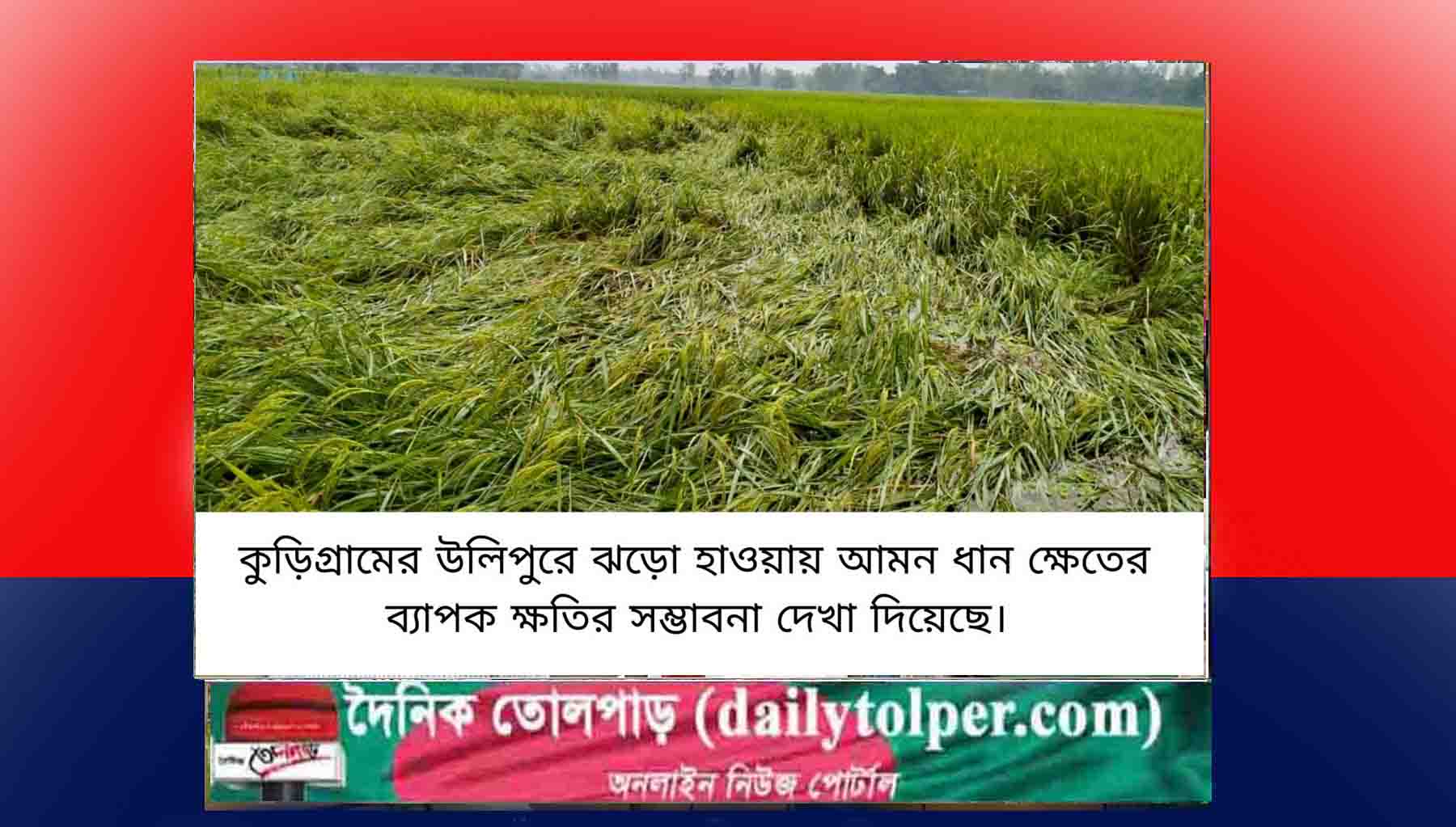 কুড়িগ্রামের উলিপুরে ঝড়ো হাওয়ায় আমন ধান ক্ষেতের ব্যাপক ক্ষতির সম্ভাবনা দেখা দিয়েছে। সে কারণে আধাপাকা, থোরধানসহ আমন ক্ষেত মাটিতে হেলে পড়েছে। গত বৃহস্পতিবার সকাল থেকে রবিবার সকাল পর্যন্ত ঝড়ো হাওয়ায় উপজেলার একটি পৌরসভা ও ১৩টি ইউনিয়নে ব্যাপক আমন ক্ষেতের ফসল মাটিতে হেলে পড়েছে।