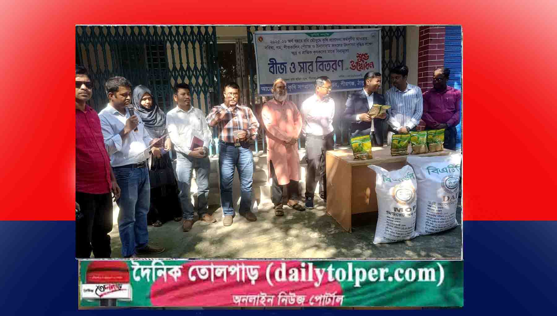 বুধবার (৫নভেম্বর) ঠাকুরগাঁও জেলার পীরগঞ্জ উপজেলার পৌর এলাকা সহ ১০টি ইউনিয়নের প্রান্তিক ও ক্ষুদ্র কৃষকের মাঝে বীজ ও সার বিতরণ করা হয়। উপজেলা কৃষি সম্প্রসারণ অধিদপ্তর এর আয়োজন করেন।