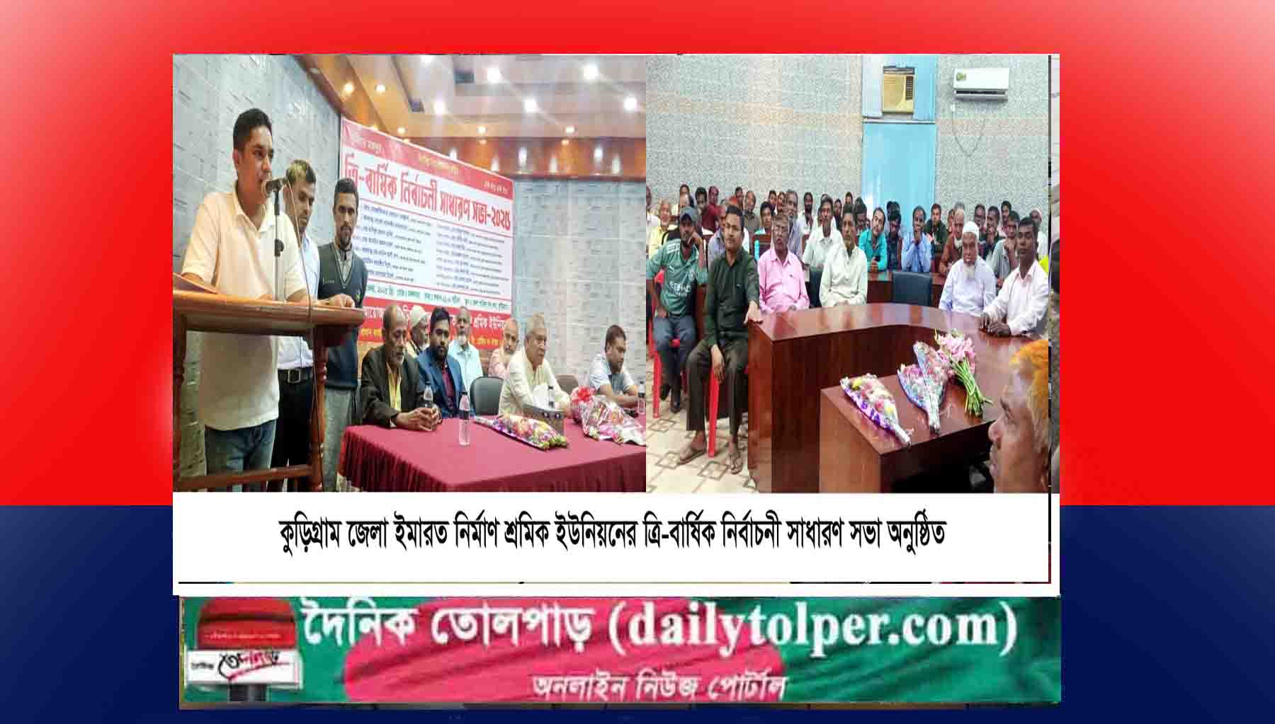 কুড়িগ্রাম জেলা ইমারত নির্মাণ শ্রমিক ইউনিয়নের সভাপতি মোঃ বেলাল হোসেনের সভাপতিত্বে এবং সাধারণ সম্পাদক মোঃ এরশাদুল হকের পরিচালনায় এ ত্রি-বার্ষিক নির্বাচনী সাধারণ সভা অনুষ্ঠিত হয়। উক্ত সভায় প্রধান অতিথি হিসেবে উপস্থিত ছিলেন- জেলা বিএনপির যুগ্ম আহ্বায়ক অধ্যাপক হাসিবুর রহমান হাসিব এবং বিশেষ অতিথি হিসেবে উপস্থিত ছিলেন, আঞ্চলিক শ্রম দপ্তর রংপুরের সহকারী পরিচালক মোঃ আতাউর রহমান মন্ডল।