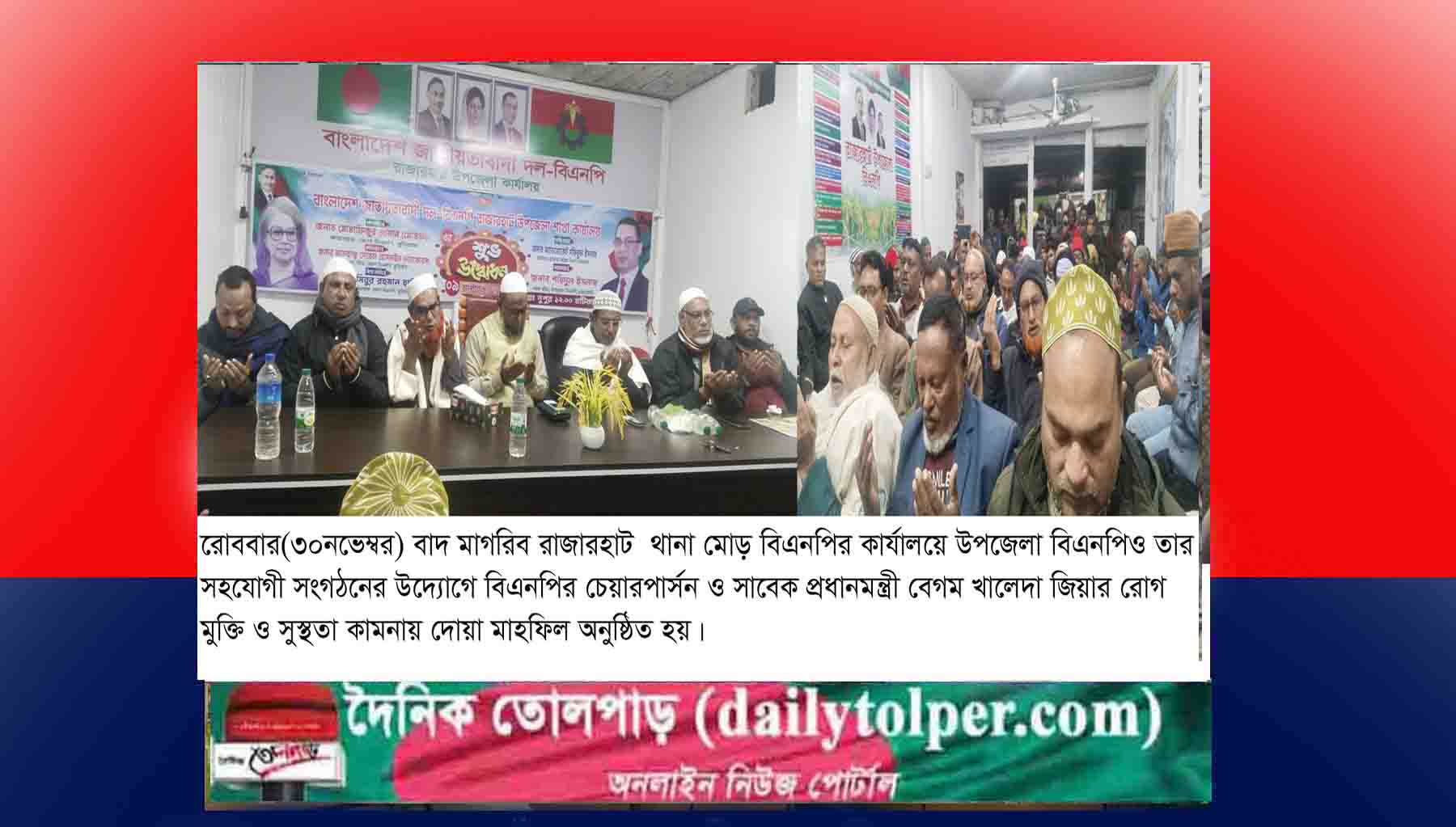 কুড়িগ্রামের রাজারহাট উপজেলা বিএনপিও তার সহযোগী সংগঠনের উদ্যোগে বিএনপির চেয়ারপার্সন ও সাবেক প্রধানমন্ত্রী বেগম খালেদা জিয়ার রোগ মুক্তি ও সুস্থতা কামনায় দোয়া মাহফিল অনুষ্ঠিত হয়েছে।
