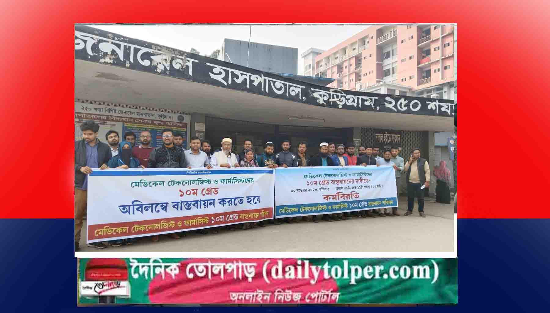 কুড়িগ্রামে মেডিকেল টেকনোলজিস্ট (সকল) ও ডিপ্লোমা ফার্মাসিস্টদের ১১তম গ্রেড থেকে ১০ম গ্রেডে উন্নীতকরণের দাবিতে দুই ঘণ্টার কর্মবিরতি পালন করেছে মেডিকেল টেকনোলজিস্ট ও ডিপ্লোমা ফার্মাসিস্ট ১০ গ্রেড বাস্তবায়ন পরিষদের জেলা শাখা। রবিবার (৩০ নভেম্বর) সকাল ৯টা থেকে ১১টা পর্যন্ত নিজ নিজ কর্মস্থলে বিরতি দিয়ে কুড়িগ্রাম জেনারেল হাসপাতালের সামনে অবস্থান করে কর্মবিরতি পালন করা হয়। কর্মবিরতি চলাকালীন রোগের পরীক্ষা নিরীক্ষা করতে না পেরে রোগী ও স্বজনদের সাময়িক ভোগান্তিতে পড়তে হয়।