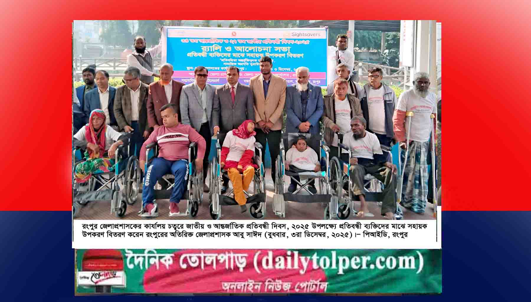 ‘প্রতিবন্ধিতা অন্তর্ভুক্তিমূলক সমাজ গড়ি, সামাজিক অগ্রগতি ত্বরান্বিত করি’—এই প্রতিপাদ্যে রংপুরে ৩৪তম আন্তর্জাতিক প্রতিবন্ধী দিবস ও ২৭তম জাতীয় প্রতিবন্ধী দিবস উদ্যাপিত হয়েছে। এ উপলক্ষ্যে বুধবার (৩রা ডিসেম্বর) সকালে জেলাপ্রশাসকের কার্যালয় চত্বর থেকে এক বর্ণাঢ্য র্যালি বের হয়ে শহরের প্রধান প্রধান সড়ক প্রদক্ষিণ করে একই স্থানে এসে শেষ হয়।