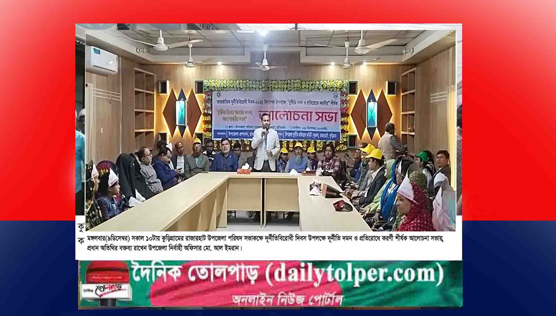 মঙ্গলবার(৯ডিসেম্বর) সকাল ১০টায় রাজারহাট উপজেলা পরিষদ সভাকক্ষে দূর্নীতিবিরোধী দিবস উপলক্ষে দূর্নীতি দমন ও প্রতিরোধে করর্ণী শীর্ষক আলোচনা সভায় উপজেলা দূর্নীতি প্রতিরোধ কমিটির সভাপতি রাশেদুল ইসলামের সভাপতিত্বে প্রধান অতিথির বক্তব্য রাখেন উপজেলা নির্বাহী অফিসার মো. আল ইমরান।