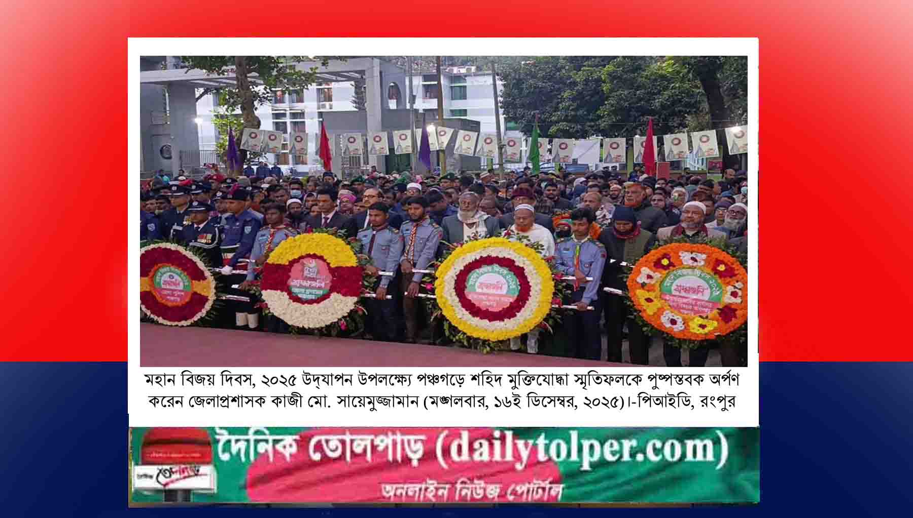 পঞ্চগড়ে যথাযোগ্য মর্যাদায় মহান বিজয় দিবস, ২০২৫ উদ্যাপিত হয়েছে। মঙ্গলবার (১৬ই ডিসেম্বর) সূর্যোদয়ের সাথে সাথে পঞ্চগড় কালেক্টরেট চত্বরে ৩১ বার তোপধ্বনির মাধ্যমে দিবসের সূচনা করা হয়। একই সাথে শহিদ মুক্তিযোদ্ধা স্মৃতিফলকে পুষ্পস্তবক অর্পণ করা হয়ে। দিবসটি উপলক্ষ্যে সকাল ৯ টায় পঞ্চগড় সরকারি অডিটোরিয়ামে আনুষ্ঠানিকভাবে জাতীয় পতাকা উত্তোলন ও কুচকাওয়াজ শেষে বীর মুক্তিযোদ্ধা, শহিদ পরিবার ও যুদ্ধাহত মুক্তিযোদ্ধা পরিবারকে সংবর্ধনা প্রদান করা হয়। সংবর্ধনা অনুষ্ঠানে প্রধান অতিথি হিসাবে উপস্থিত ছিলেন পঞ্চগড়ের জেলাপ্রশাসক কাজী মো. সায়েমুজ্জামান।