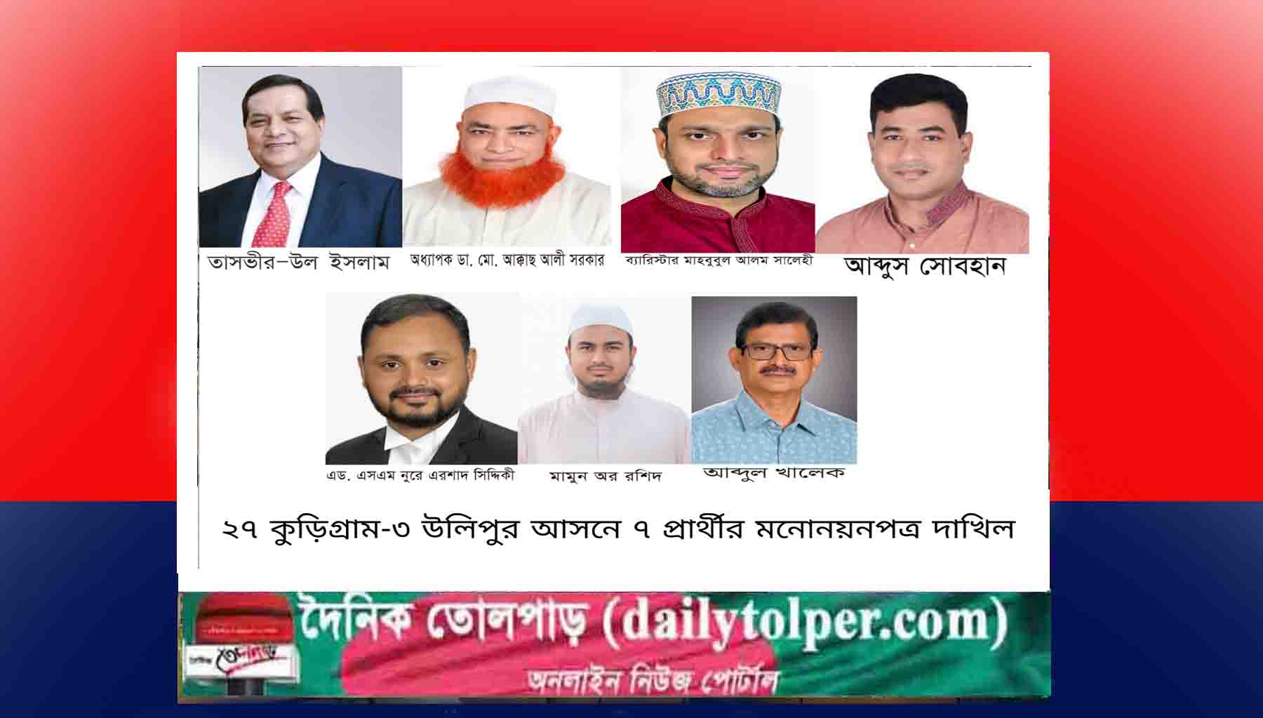 ত্রয়োদশ জাতীয় সংসদ নির্বাচনে ২৭ কুড়িগ্রাম-৩ (উলিপুর) আসনে ৭ জন প্রার্থী মনোনয়নপত্র দাখিল করেছেন। মনোনয়নপত্র দাখিলের শেষ দিন আজসোমবার (২৯ ডিসেম্বর) বিকেল ৫টা পর্যন্ত রিটার্নিং অফিসারের কার্যালয় এবং সহকারী রিটার্নিং অফিসারের কার্যালয়ে মনোনয়নপত্র জমা দেন তারা।