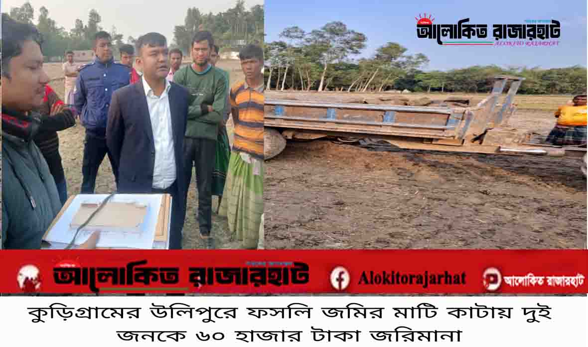 কুড়িগ্রামের উলিপুরে অনুমতি ছাড়া অবৈধভাবে ফসলি জমির উপরিভাগের মাটি কাটার দায়ে পৃথক অভিযানে ভ্রাম্যমাণ আদালত দুইজনকে ৬০ হাজার টাকা জরিমানা করেছে। গতকাল বুধবার (৩১ ডিসেম্বর) বিকেলে উপজেলার বিভিন্ন এলাকায় ভ্রাম্যমাণ আদালত পরিচালনা করেন সহকারী কমিশনার (ভূমি) ও এক্সিকিউটিভ ম্যাজিস্ট্রেট এস এম মেহেদী হাসান।