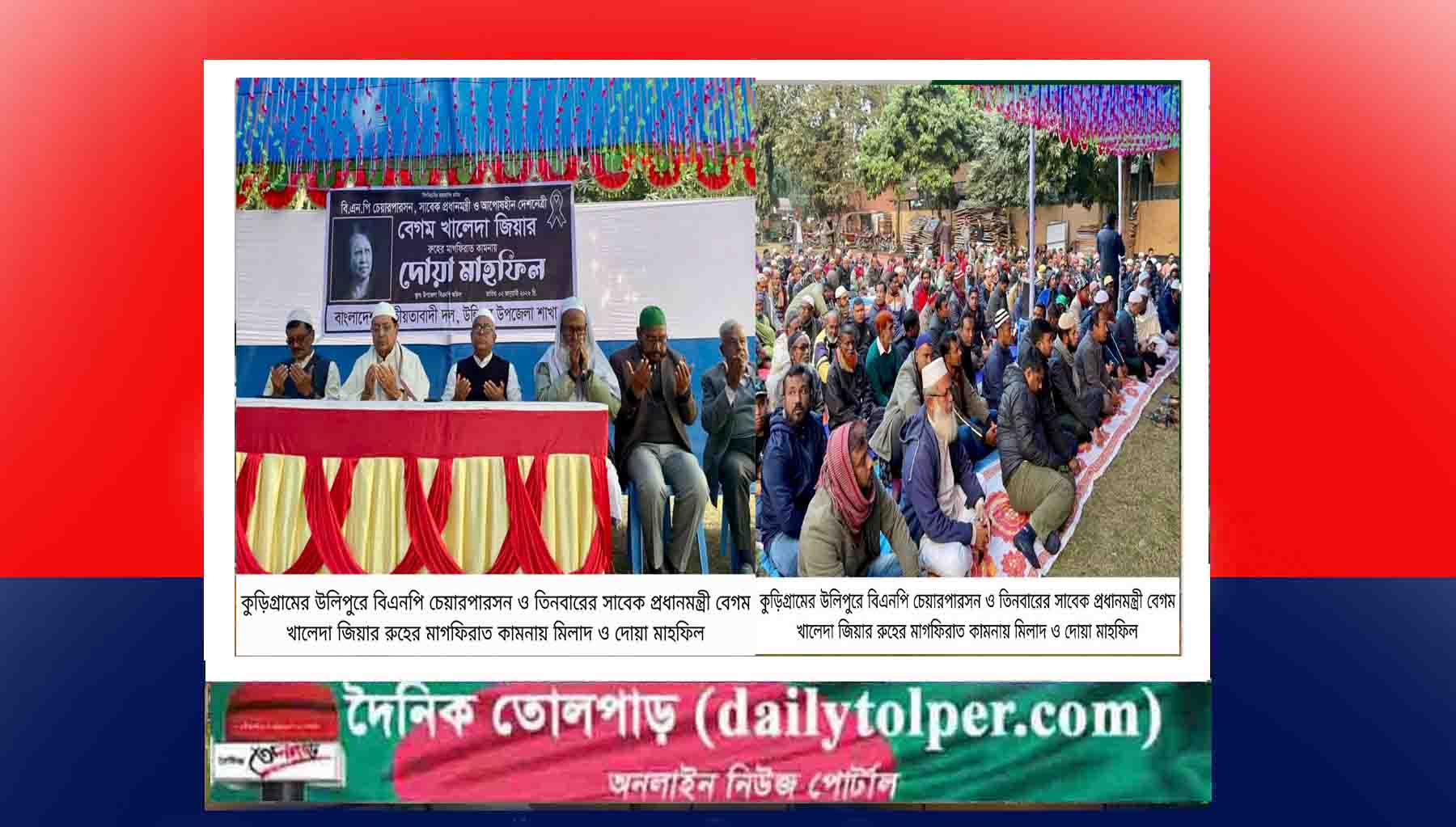 কুড়িগ্রামের উলিপুরে বিএনপি চেয়ারপারসন ও তিনবারের সাবেক প্রধানমন্ত্রী বেগম খালেদা জিয়ার রুহের মাগফিরাত কামনায় মিলাদ ও দোয়া মাহফিল অনুষ্ঠিত হয়েছে। শুক্রবার (২ জানুয়ারি) বিকেলে দলীয় কার্যালয়ে বাংলাদেশ জাতীয়তাবাদী দল (বিএনপি) উপজেলা শাখার আয়োজনে এই দোয়া মাহফিল অনুষ্ঠিত হয়।
