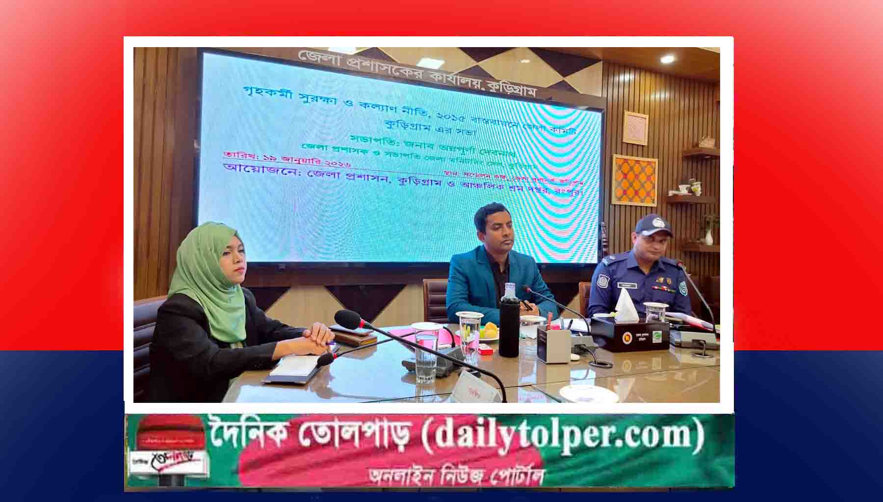 গৃহকর্মী সুরক্ষা ও কল্যাণ নীতি-২০১৫ বাস্তবায়নে কুড়িগ্রাম জেলা মনিটরিং সেলের সভা অনুষ্ঠিত হয়েছে। কুড়িগ্রাম জেলা প্রশাসন ও রংপুর আঞ্চলিক শ্রম দপ্তরের আয়োজনে সোমবার সকালে জেলা প্রশাসকের সম্মেলন কক্ষে এ সভা অনুষ্ঠিত হয়।