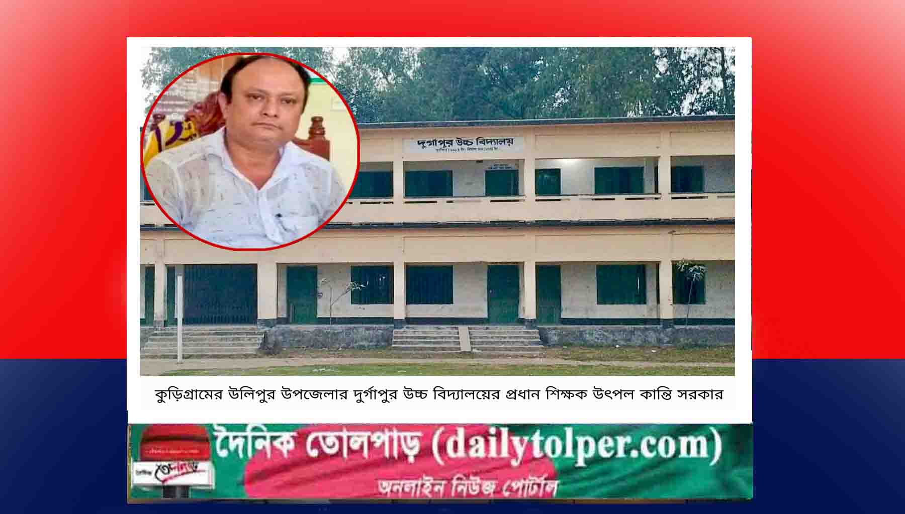 কুড়িগ্রামের উলিপুর উপজেলার দুর্গাপুর উচ্চ বিদ্যালয়ের প্রধান শিক্ষক উৎপল কান্তি সরকারকে তার পদসহ সকল দায়িত্ব থেকে সাময়িকভাবে স্থগিত রাখা হয়েছে। রবিবার (২৫ জানুয়ারি) বিকেলে অনুষ্ঠিত এক বৈঠকে এ সিদ্ধান্ত নেওয়া হয়। বিষয়টি নিশ্চিত করেছেন উলিপুর উপজেলা নির্বাহী অফিসার ও বিদ্যালয়ের ব্যবস্থাপনা পর্ষদের সভাপতি মাহমুদুল হাসান।