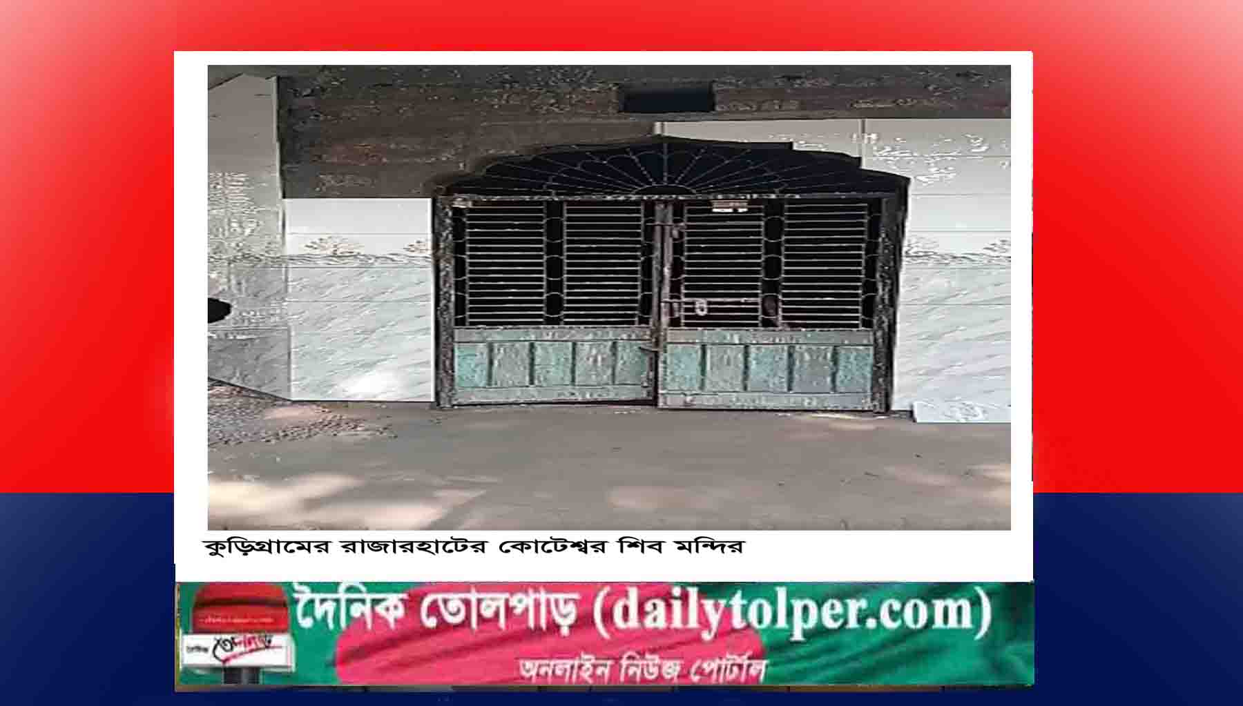 ত্রয়োদশ জাতীয় সংসদ নির্বাচনকে সামনে রেখে কুড়িগ্রামের রাজারহাটের ঘড়িয়ালডাঙ্গা ইউনিয়েনের ঐতিহ্যবাহী কোটেশ্বর শিব মন্দিরের টাইলস ভেঙ্গে ভিতরে ঢ়ুকে শিব লিঙ্গের পাশের ত্রিশূল ভেঙ্গে ফেলে দিয়ে ৫কেজি ওজনের কাসার ঘন্টা নিয়ে চম্পট দিয়েছে দূর্বৃত্তরা। এ ঘটনায় ওই এলাকার সনাতন ধর্মাবলম্বীদের মাঝে ক্ষোভের সৃষ্টি হয়েছে।