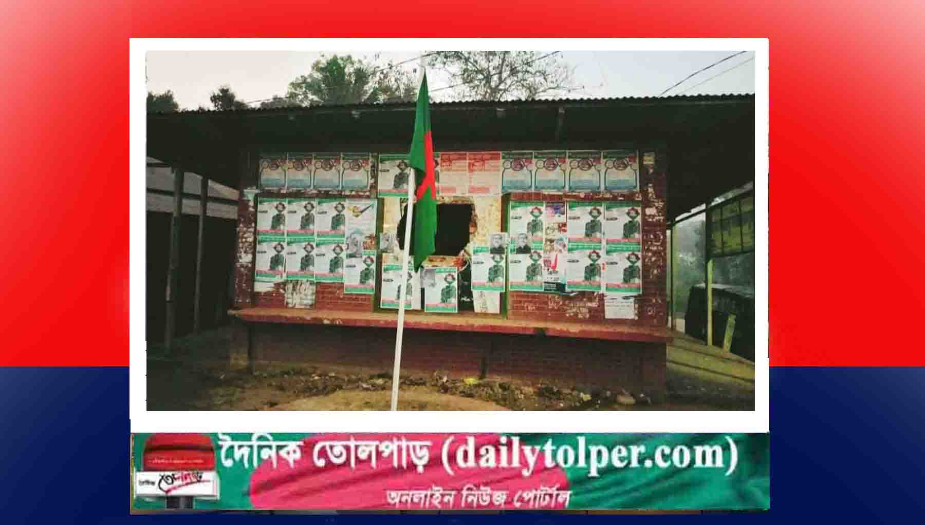 স্থানীয় সূত্রে জানা যায়, মঙ্গলবার দিবাগত রাতে কে বা কারা শেখ মুজিবর রহমান ও সাবেক প্রধানমন্ত্রী শেখ হাসিনার কয়েকটি লিফলেট জাতীয় ছবি টাঙিয়ে জাতীয় পতাকা উত্তোলন করেন। বুধবার সকালে বিষয়টি জানাজানি হলে পরে দেয়ালে লাগানো ছবি ও পতাকা খুলে ফেলা হয়।