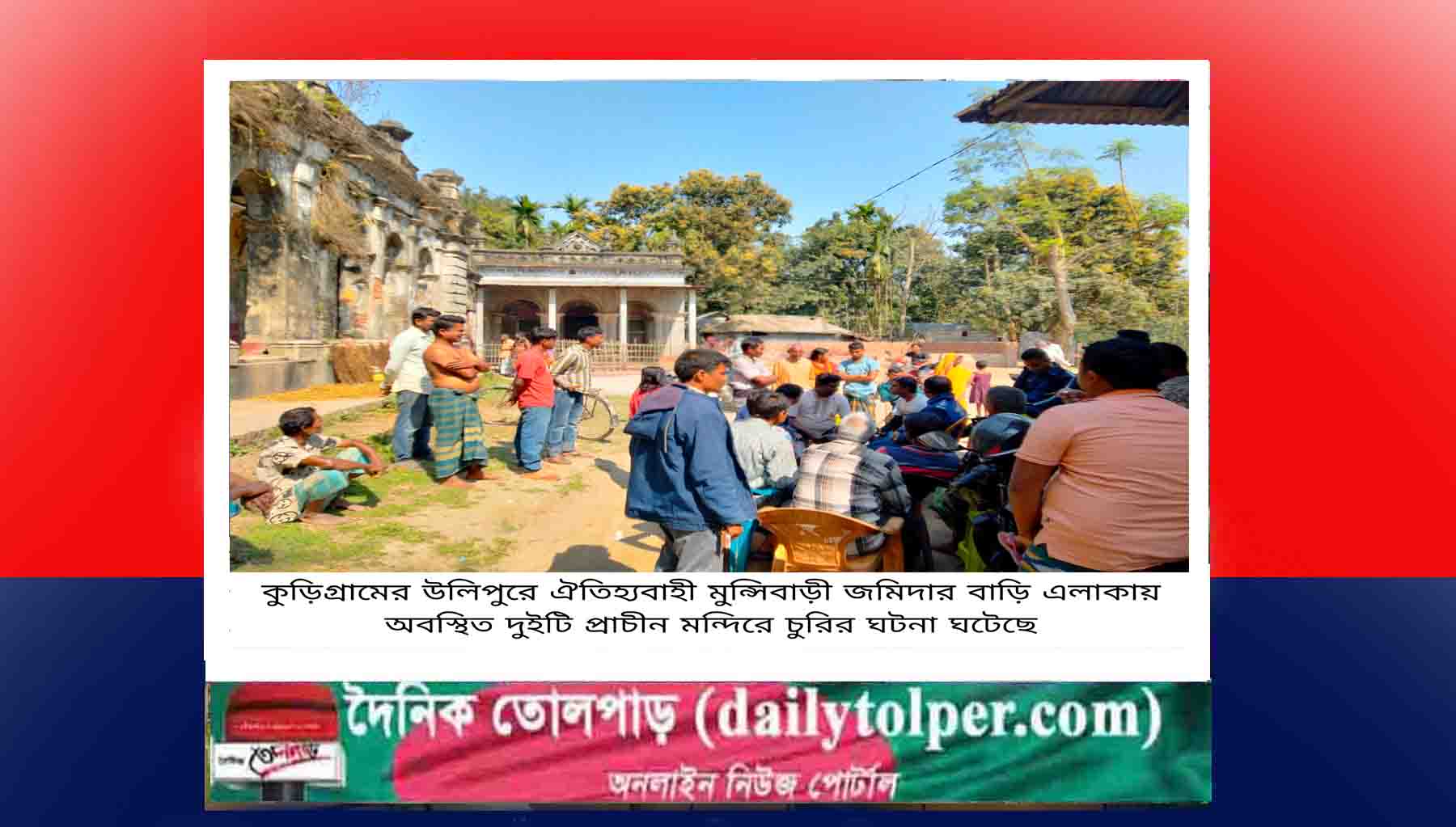 কুড়িগ্রামের উলিপুরে ঐতিহ্যবাহী মুন্সিবাড়ী জমিদার বাড়ি এলাকায় অবস্থিত দুইটি প্রাচীন মন্দিরে চুরির ঘটনা ঘটেছে বলে অভিযোগ উঠেছে। মঙ্গলবার (১৭ ফেব্রুয়ারি) দিবাগত রাত থেকে বুধবার সকাল ৬টার মধ্যে কোনো এক সময় দুর্বৃত্তরা এ ঘটনা ঘটান বলে মন্দির কমিটির লোকজন অভিযোগ করেছেন। এ ঘটনায় এলাকায় চাঞ্চল্যের সৃষ্টি হয়েছে।