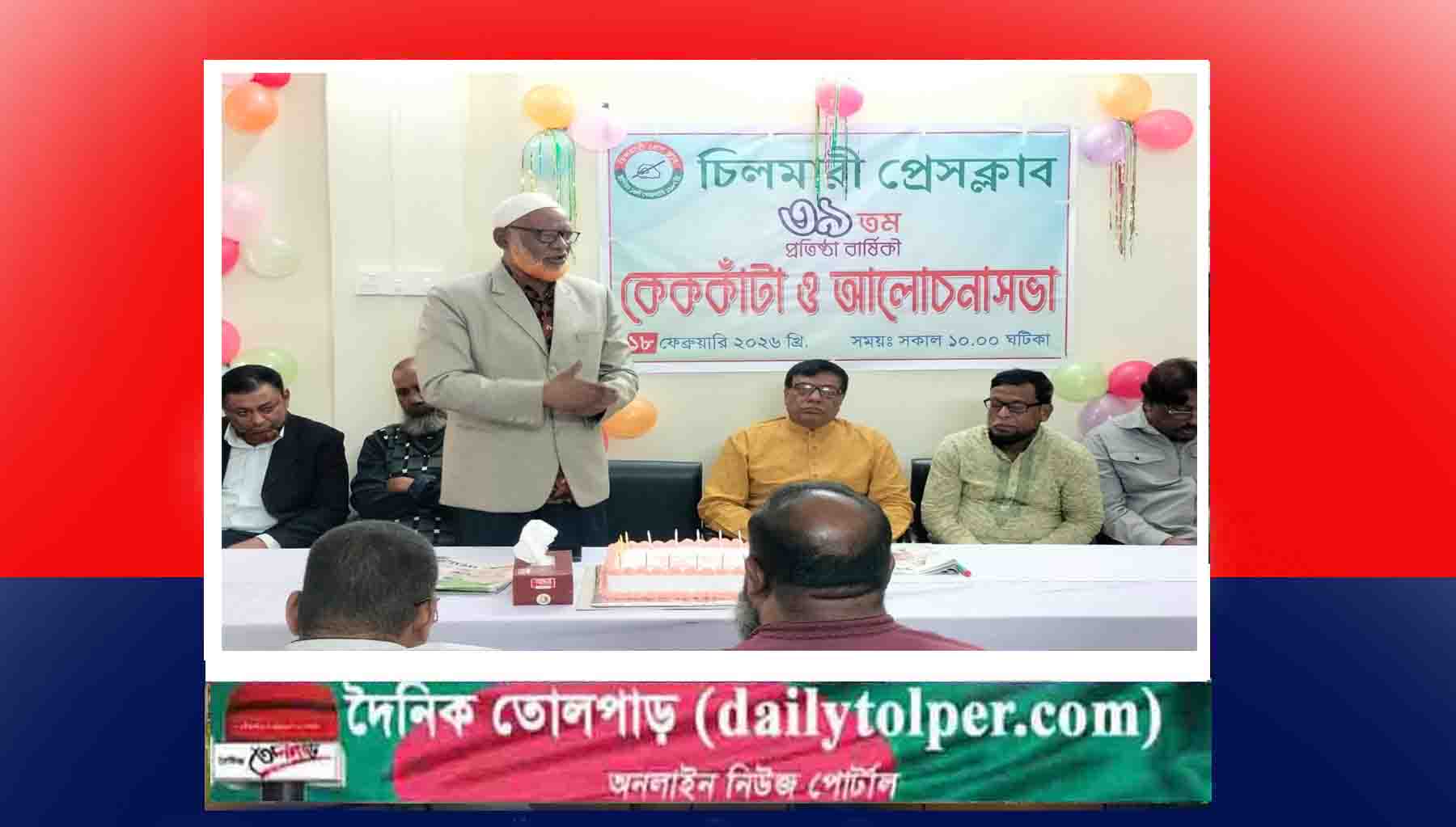 কুড়িগ্রামের চিলমারিতে বিভিন্ন আয়োজনের মধ্য দিয়ে "চিলমারী প্রেসক্লাবের ৩৯তম প্রতিষ্ঠা বার্ষিকী পালিত হয়েছে। বুধবার (১৮ই ফেব্রুয়ারী) সকাল ১১টার দিকে প্রেসক্লাব কক্ষে কেক কাটা ও আলোচনা সভা অনুষ্ঠিত হয়েছে। চিলমারী প্রেসক্লাবের সভাপতি, নজরুল ইসলাম সাবুর সভাপতিত্বে ও সাংগঠনিক সম্পাদক সাওরাত হোসেন সোহেলের সঞ্চালনায়।