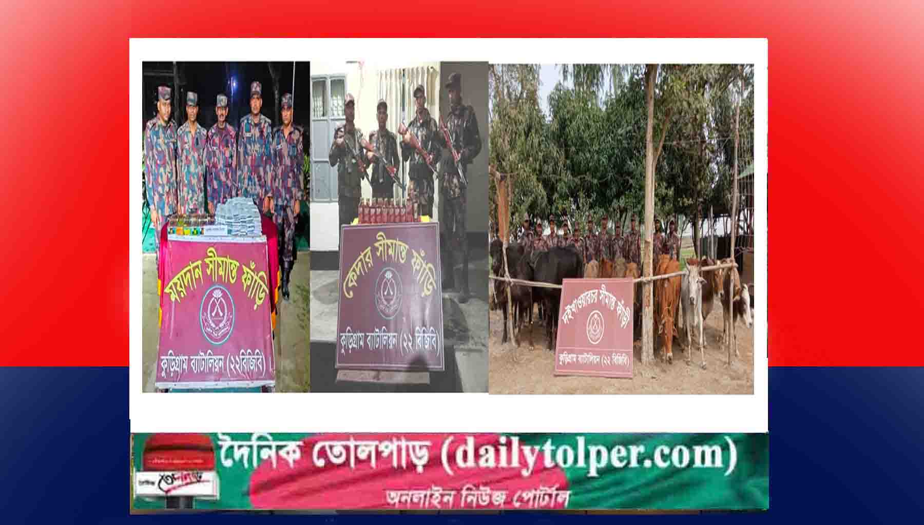 কুড়িগ্রাম ব্যাটালিয়ন (২২ বিজিবি)-এর বিশেষ আভিযানিক দল গত ২৪ ঘণ্টায় দায়িত্বপূর্ণ সীমান্ত এলাকায় পৃথক অভিযান পরিচালনা করে বিপুল পরিমাণ ভারতীয় চোরাচালানী মালামাল জব্দ করেছে।