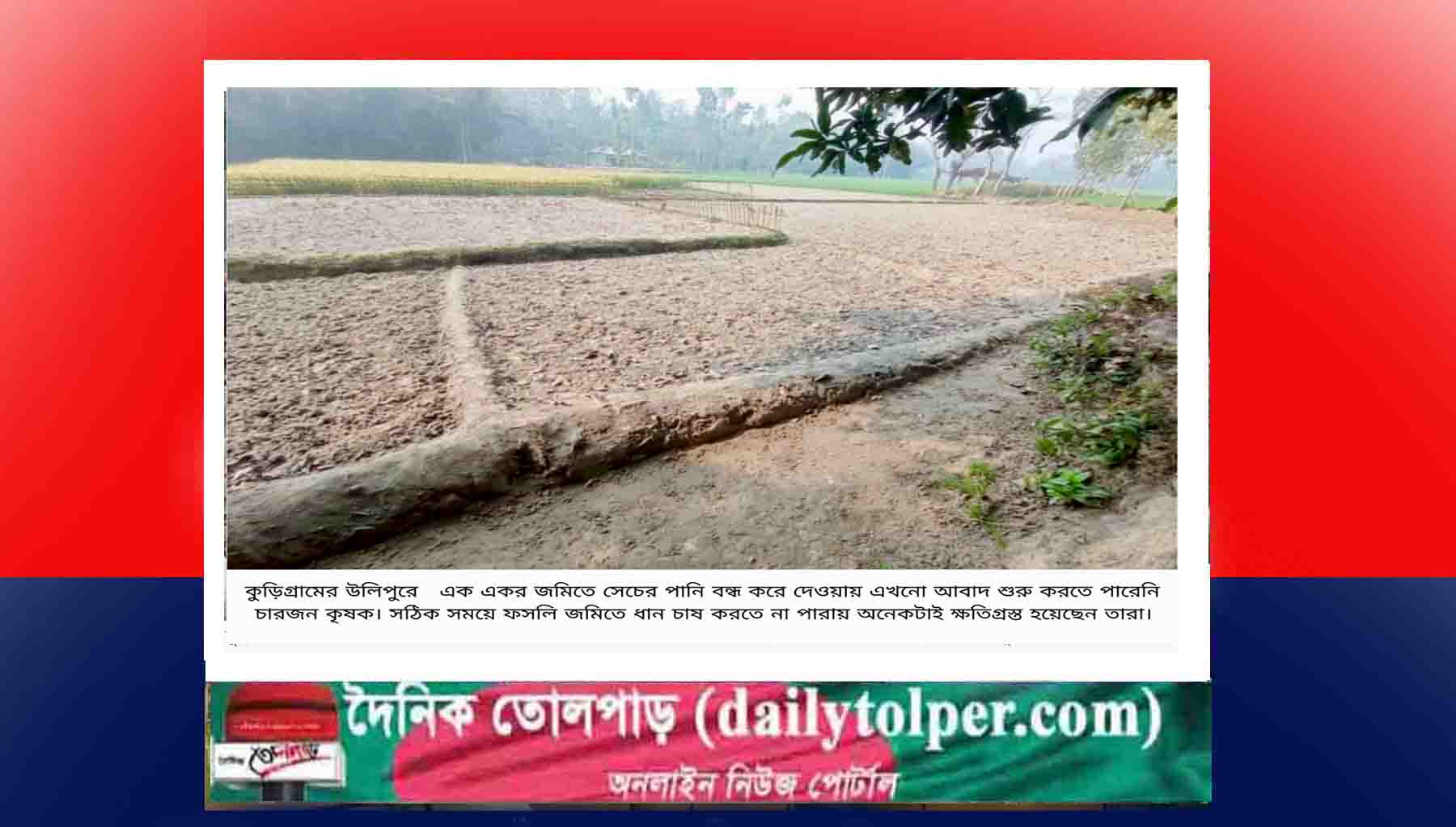 কুড়িগ্রামের উলিপুরে ব্যক্তিগত বিরোধের জেরে সেচের পানি না দেওয়ায় চাষাবাদ করতে পারেনি এক কৃষক পরিবার। এ ঘটনায় জমির মালিক এরশাদুল হক ইউএনও বরাবর লিখিত অভিযোগ দাখিল করেছেন।