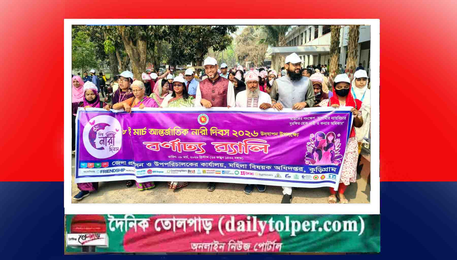 র্যালি ও আলোচনা সভার মধ্য দিয়ে কুড়িগ্রামে আন্তর্জাতিক নারী দিবস পালিত হয়েছে। রোববার (৮ মার্চ) সকাল ১১টায় জেলা প্রশাসকের কার্যালয় চত্বর থেকে একটি বর্ণাঢ্য র্যালি বের করা হয়। র্যালিটি শহরের প্রধান প্রধান সড়ক প্রদক্ষিণ করে পুনরায় একই স্থানে এসে শেষ হয়। এতে বিভিন্ন সরকারি-বেসরকারি দপ্তরের কর্মকর্তা-কর্মচারী, স্বেচ্ছাসেবী সংগঠন এবং নারী সংগঠনের সদস্যরা অংশগ্রহণ করেন।