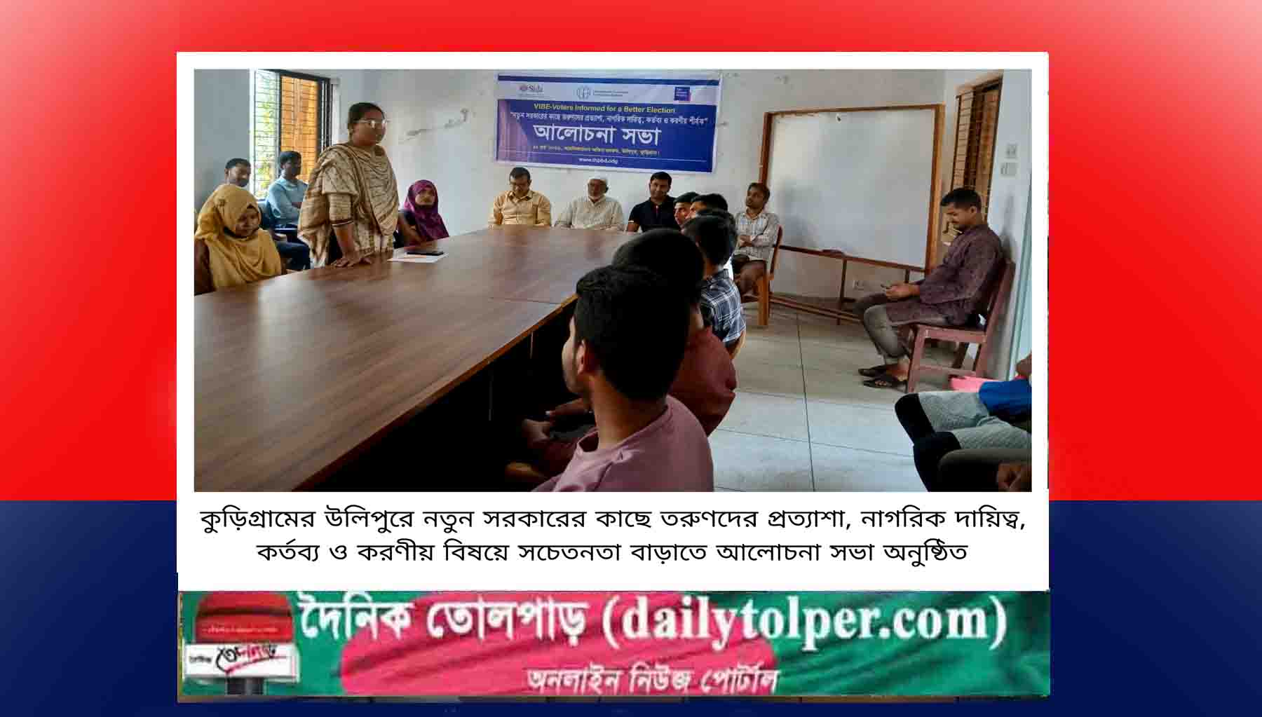 কুড়িগ্রামের উলিপুরে নতুন সরকারের কাছে তরুণদের প্রত্যাশা, নাগরিক দায়িত্ব, কর্তব্য ও করণীয় বিষয়ে সচেতনতা বাড়াতে আলোচনা সভা অনুষ্ঠিত হয়েছে। বৃহস্পতিবার (১২ মার্চ) বিকেলে উলিপুর আরডিআরএস হলরুমে বিভিন্ন সামাজিক সংগঠনের প্রতিনিধি, তরুণ নেতা, শিক্ষার্থী ও সচেতন নাগরিকদের নিয়ে এ সভা অনুষ্ঠিত হয়।