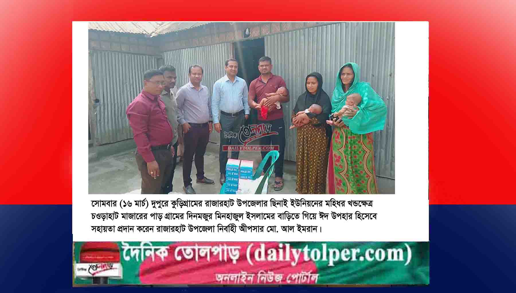দৈনিক যায়যায়দিন ও দৈনিক করতোয়া পত্রিকাসহ বিভিন্ন নিউজ পোর্টালে সংবাদ প্রকাশের পর কুড়িগ্রামের রাজারহাটে একসঙ্গে তিন কন্যা সন্তানের জন্ম দেওয়া দরিদ্র মা রনজিনা বেগমের পাশে দাঁড়িয়েছেন উপজেলা প্রশাসন। দরিদ্র ওই পরিবারটিকে ঈদ উপহার দিয়েছেন রাজারহাট উপজেলা নির্বাহী অফিসার মো. আল ইমরান।