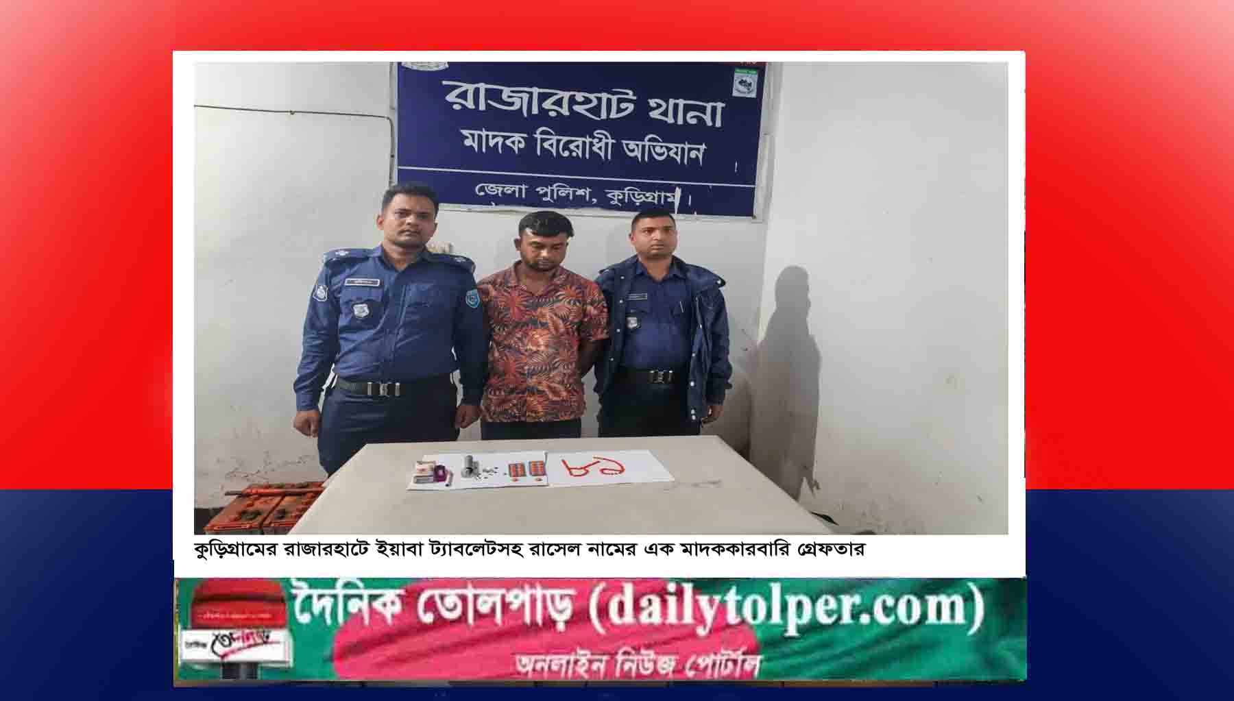 কুড়িগ্রামের রাজারহাট থানা পুলিশ ইয়াবা ট্যাবলেটসহ রাসেল নামের এক মাদককারবারিকে গ্রেফতার করে জেলহাজতে প্রেরণ করেছে। বৃহস্পতিবার (২৬ মার্চ) রাতে উপজেলার চাকিরপশার ইউনিয়নের মন্ডলপাড়া গ্রাম এলাকায় অভিযান চালিয়ে পুলিশ তাকে আটক করে। শুক্রবার সকালে তাকে কুড়িগ্রাম জেলহাজতে প্রেরণ করে।