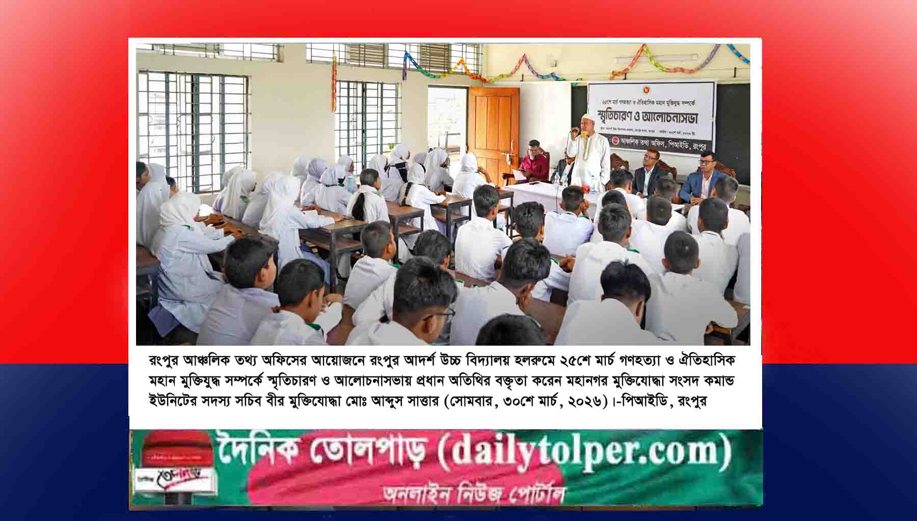 রংপুর আঞ্চলিক তথ্য অফিসের উদ্যোগে ২৫শে মার্চ গণহত্যা ও ঐতিহাসিক মহান মুক্তিযোদ্ধা সম্পর্কে স্মৃতিচারণ ও আলোচনাসভা অনুষ্ঠিত হয়েছে। সোমবার (৩০শে মার্চ) দুপুরে রংপুর আদর্শ উচ্চ বিদ্যালয় হলরুমে অনুষ্ঠিত স্মৃতিচারণ ও আলোচনাসভায় প্রধান অতিথি হিসাবে উপস্থিত ছিলেন রংপুর মহানগর মুক্তিযোদ্ধা সংসদ কমান্ড ইউনিটের সদস্য সচিব বীর মুক্তিযোদ্ধা মোঃ আব্দুস সাত্তার। অনুষ্ঠানে সভাপতিত্ব করেন রংপুর আঞ্চলিক তথ্য অফিসের সিনিয়র তথ্য অফিসার মোঃ শাহজাহান আলী।