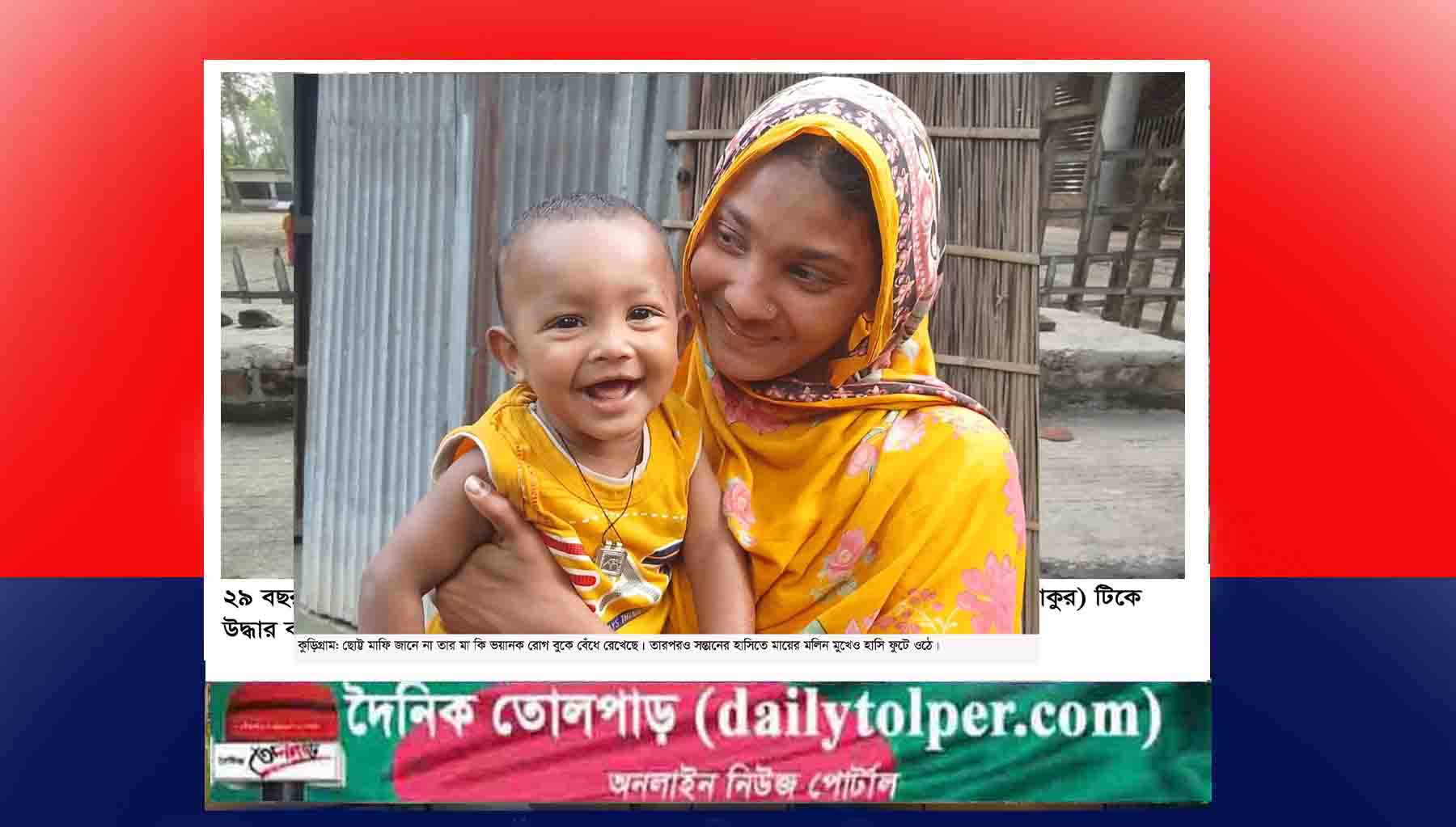 দশ মাস বয়সের প্রণোচ্ছল শিশু মাফি জানে না তার মা কি ভয়ানক রোগ বুকে বহন করে বেড়াচ্ছে। সে সারাক্ষণ মায়ের কাছে থাকতে চাইছে, তার মায়ের বুকের দুধ পান করতে চাইছে! কিন্তু কঠিন রোগ তার মায়ের সমস্ত আশা আকাংখায় জল ঢেলে দিয়ে শরীর থেকে সমস্ত কিছুই চুষে নিয়ে যাচ্ছে। ইচ্ছে থাকলেও সন্তানকে মায়ের বুকের দুধ দিতে পারছে না বাল্যবিবাহের শিকার আখিমনি(১৮)। দরিদ্র পরিবারে মাত্র সাড়ে ১৫ বছর বয়সে তাকে বাল্যবিয়ে দেয়া হয়। স্বামীর সংসারে প্রথম প্রথম ভালোই দিন কাটছিল তার। কিন্তু সন্তান পেটে আসার পর থেকেই পুরনো রোগ যেন মাথা চাড়া দিয়ে উঠল। হঠাৎ করেই শশুর বাড়ীর লোকজন জানল মেয়েটি জন্ম থেকেই হার্টের ফুটো ও ভাল্ব সমস্যায় ভুগছে। রোগ গোপন করায় মেয়েকে বাপের বাড়িতে পাঠানো হলো। বলা হলো চিকিৎসা শেষে সুস্থ্য হয়ে যেন বাড়ি ফেরে। কিন্তু আখিমনির দরিদ্র বাবা-মায়ের সামর্থ নেই মেয়ের চিকিৎসা ব্যয় মেটানো। ফলে বাড়িভিটা থেকে দুই শতক জমি বিক্রি করে চলল আখিমনির চিকিৎসা। প্রথমে কুড়িগ্রাম, পরে রংপুর মেডিকেল কলেজ হাসপাতাল এবং শেষে ঢাকার গ্রীন লাইফ মেডিকেল কলেজ ও হার্ট সেন্টারে পরীক্ষা-নিরীক্ষা করা হয়। চিকিৎসকরা জানান, দ্রæত অপারশেন করতে হবে এজন্য প্রায় ৬ লক্ষ টাকা প্রয়োজন! কিন্তু দিনমজুর বাবা কিভাবে এত টাকা সংগ্রহ করবেন। চোখের সামনে সন্তান এবং নাতির কষ্ট দেখে বুক ফেঁটে যাচ্ছে বাবা-মায়ের। তাদের বুকফাঁটা কান্নায় ভারি হয়ে আসছে পরিবেশ! এমন পরিস্থিতিতে সহ্নদয়বান ব্যক্তিদের কাছে সহযোগিতা চেয়েছে পরিবারের লোকজন।