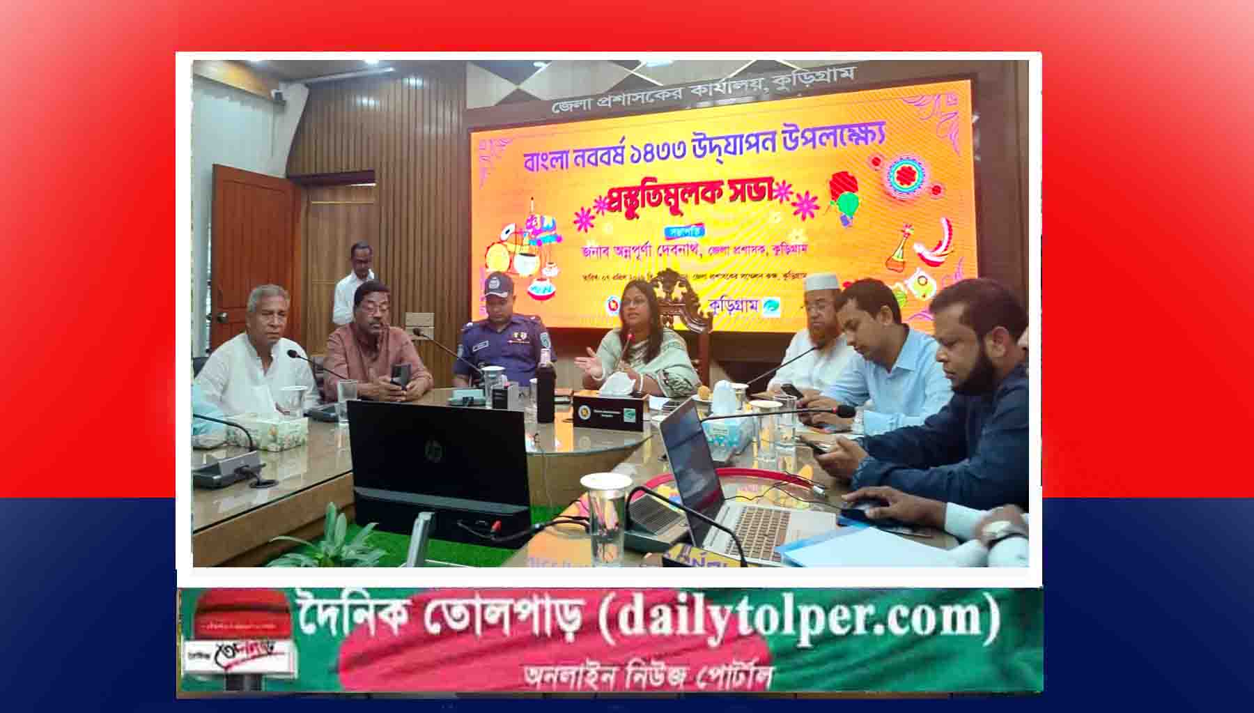 বাংলা নববর্ষ ১৪৩৩ উদযাপন উপলক্ষে কুড়িগ্রামে প্রস্তুতিমূলক সভা অনুষ্ঠিত হয়েছে। জেলা প্রশাসনের আয়োজনে মঙ্গলবার সকালে জেলা প্রশাসকের সম্মেলন কক্ষে আয়োজিত এ সভায় সভাপতিত্ব করেন জেলা প্রশাসক অন্নপূর্ণা দেবনাথ।